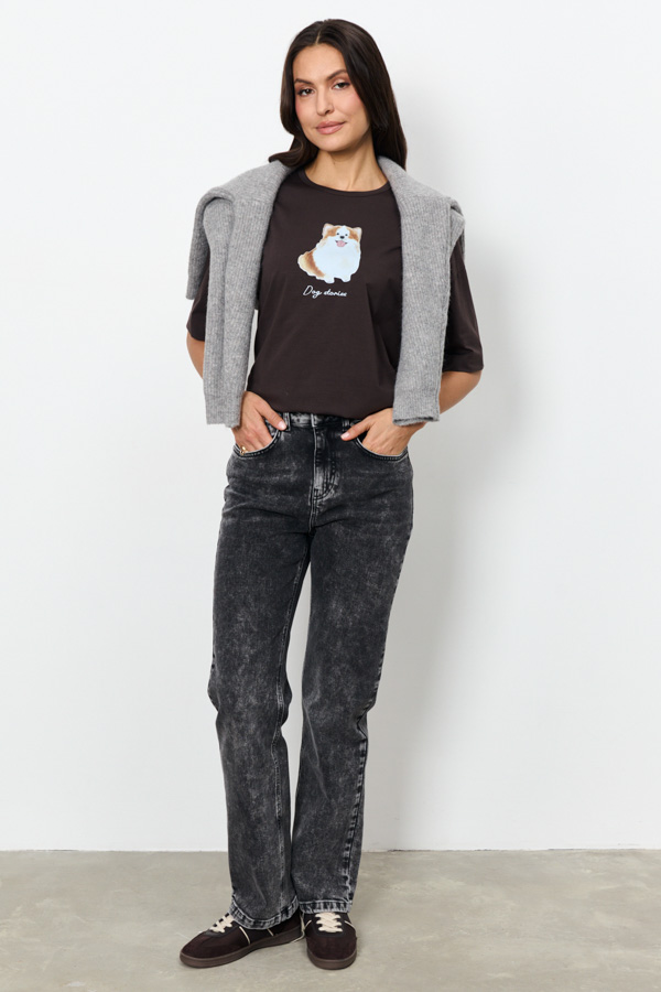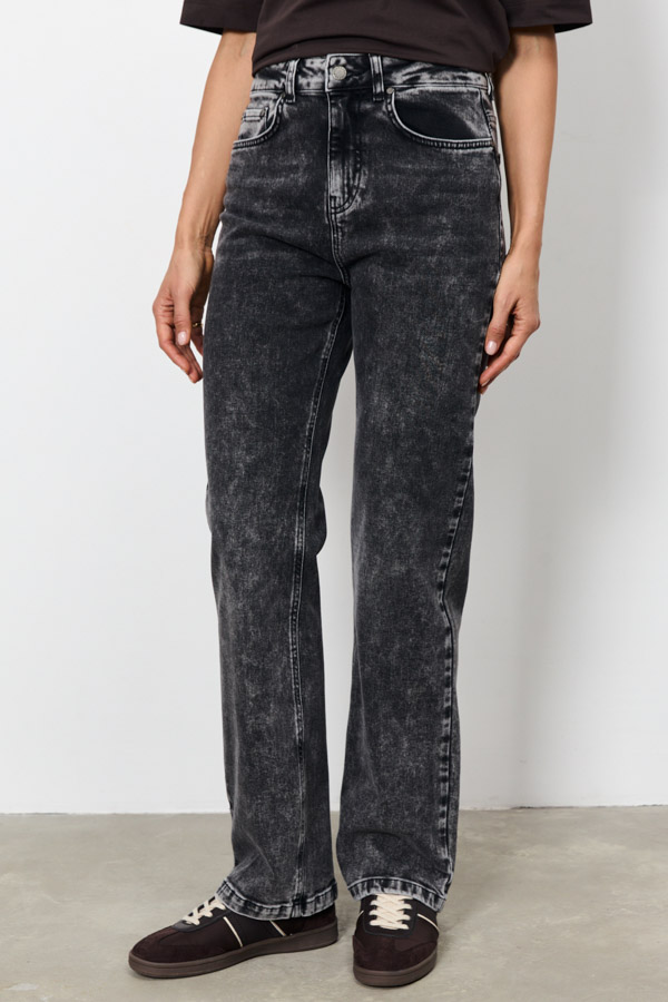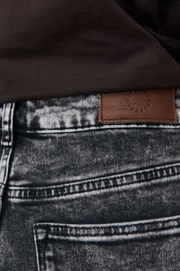 Брюки из эластичного денима выполнены по классической джинсовой технологии (варка с эффектом легкого выбеливания). Прямой классический крой. На задней части брюк выполнены накладные карманы, на передней - карманы с подкройным бочком. Притачной пояс со шлёвками. Застёжка на молнию-гульфик и пуговицу.