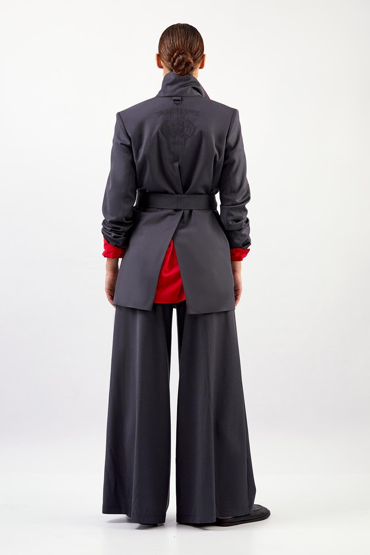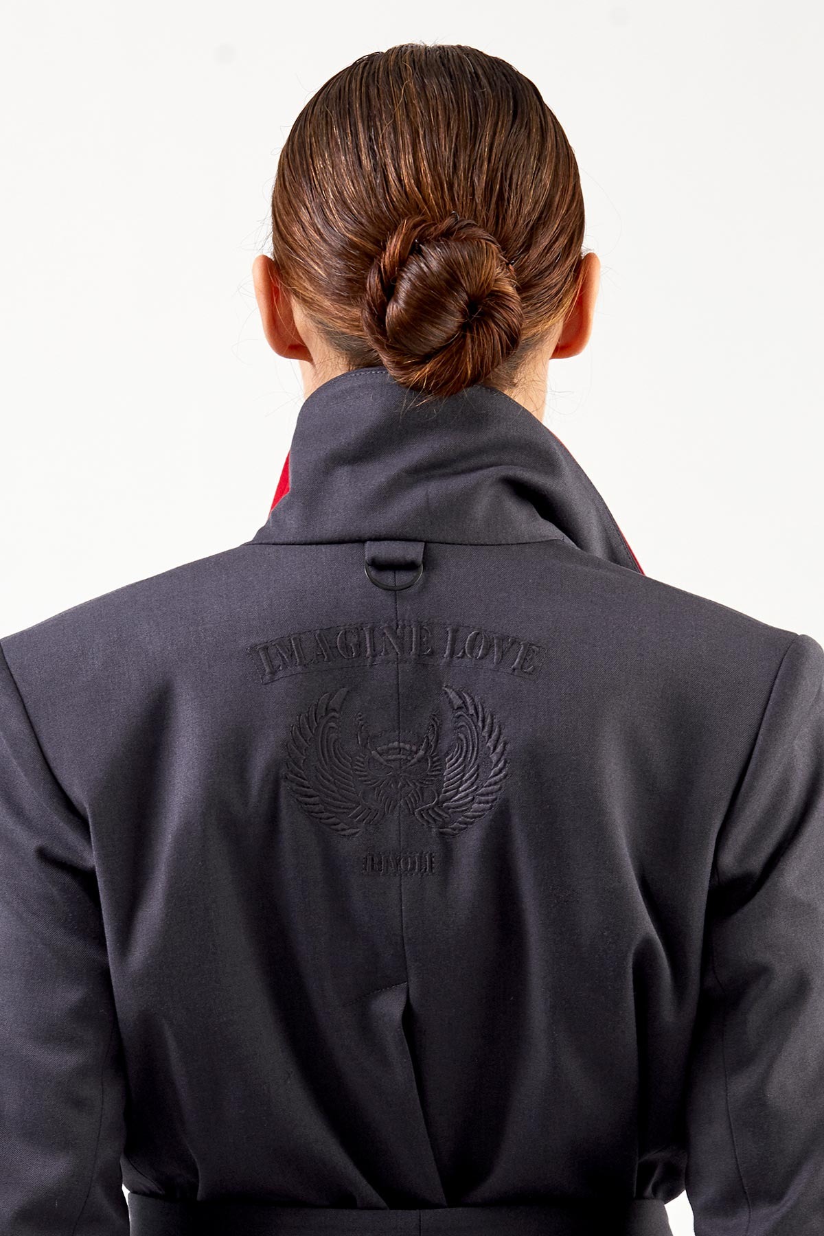 - сзади вышивка и кожаная аппликация с логотипом бренда и пата с полукольцом
