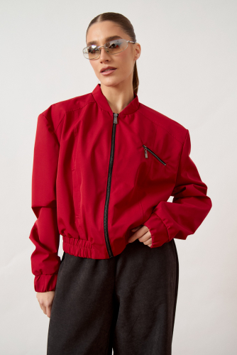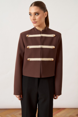 Жакет женский, укороченный, прямого силуэта, из плотной костюмной ткани в стиле милитари. Модель с воротником-стойкой и центральной бортовой застежкой (стык в стык) на потайные крючки или кнопки. Перед оформлен шестью декоративными горизонтальными патами из плетеного шнура, каждая из которых дополнена металлической пуговицей. Рукав втачной, двухшовный, классической длины. Изделие на притачной подкладке, плечевой пояс подчеркнут плечевыми накладками.
