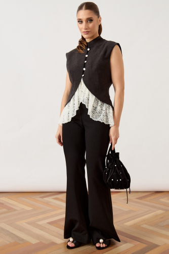рюки из аналогичной ткани бежевого цвета, свободного силуэта, расширенные от бедра. Модель на притачном поясе, с глубокими складками у талии. Особенностью модели является эластичная сборка по низу брючин