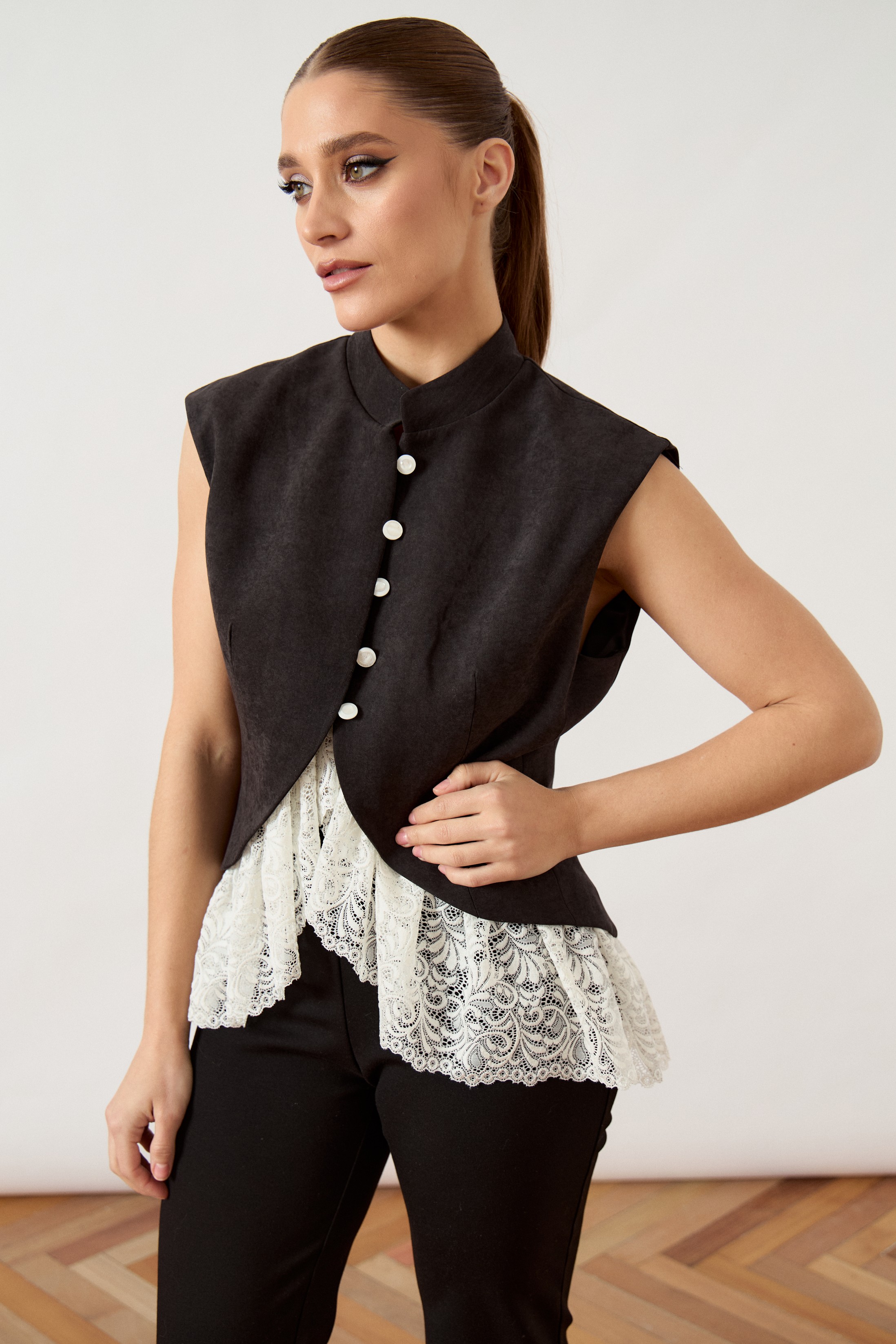 Жилет приталенного силуэта из костюмной ткани, на подкладке. Модель с воротником-стойкой и центральной застежкой на пять декоративных контрастных пуговиц. Полочка с нагрудными вытачками. Нижний край жилета имеет фигурный вырез, декорированный притачной широкой деталью из кружевного полотна с фестончатым краем, создающей эффект многослойности. Пройма обработана обтачкой.