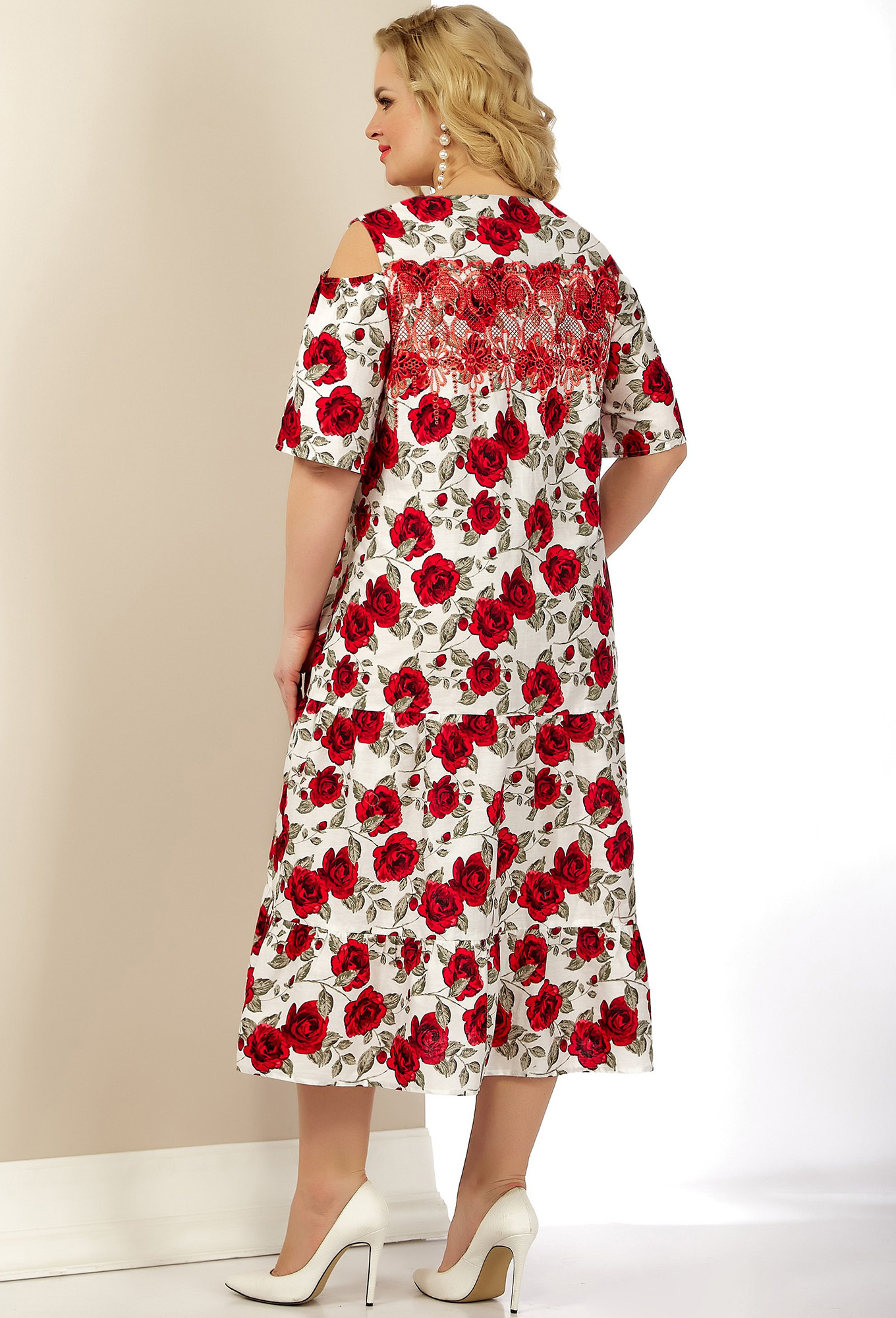Платье женское из хлопчатобумажной ткани с принтом «розы» и шитьем и ажурной вышивкой. Платье полуприлегающего силуэта, отрезное по талии; без подкладки, с плечевыми накладками. Рукав на резинки, плечико открыто. Платье состоящие из 3 воланов.