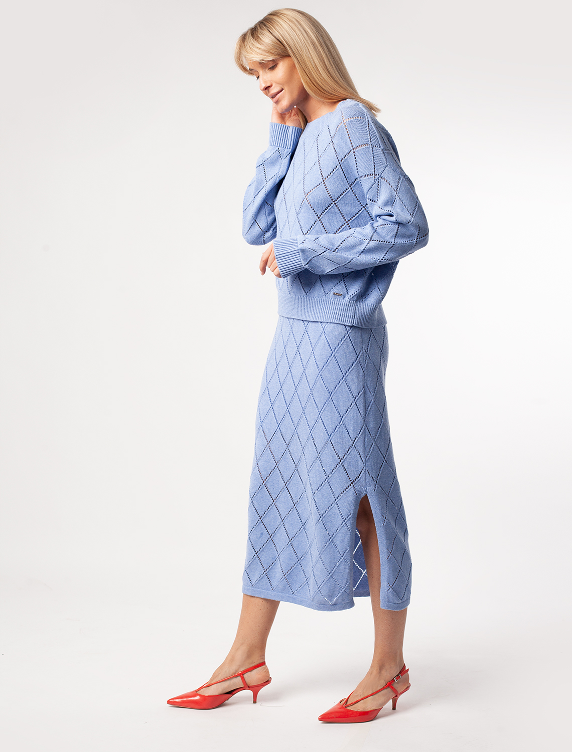 Юбка прямого силуэта выполнена узорной вязкой из мягкой хлопковой пряжи. Тонкий ажурный трикотаж идеально подходит для теплой весны и лета, в нем будет комфортно и не жарко. Модель дополнена разрезом на ноге и подкладкой из трикотажного полиэстера, такой материал гарантирует формоустойчивость юбки и скрывает излишнюю прозрачность. Сочетается в костюме с джемпером D33.007 и D39.629
