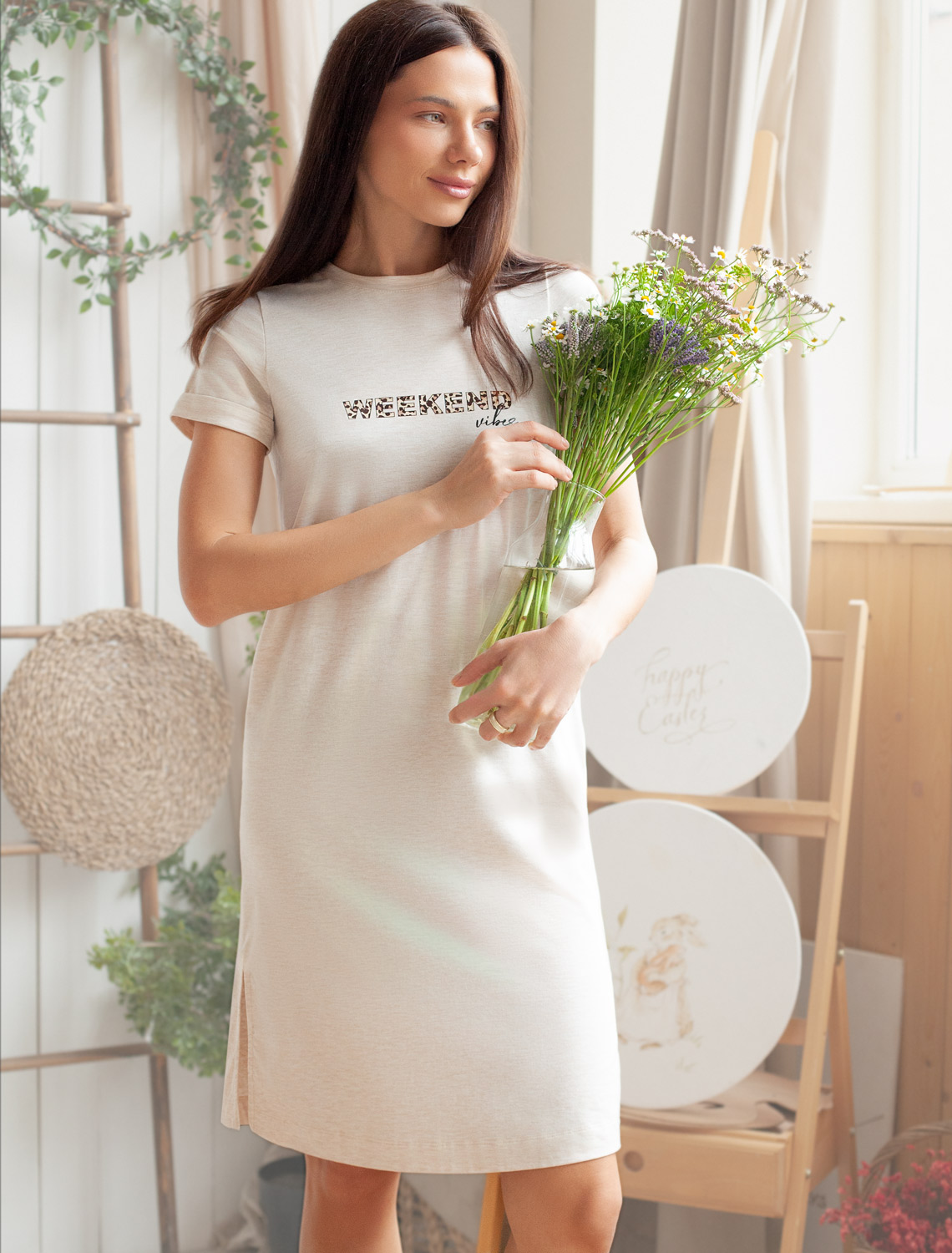 92%Хлопок 8%ПУ Домашнее платье выполнено из премиального хлопка с авторским принтом. Weekend vibes - настрой на выходные. Изделие приятно ощущается на теле, а разрезы по бокам обеспечивают удобную посадку не сковывая движений. Наличие эластана в составе изделия способствует формоустойчивости и меньшей сминаемости.