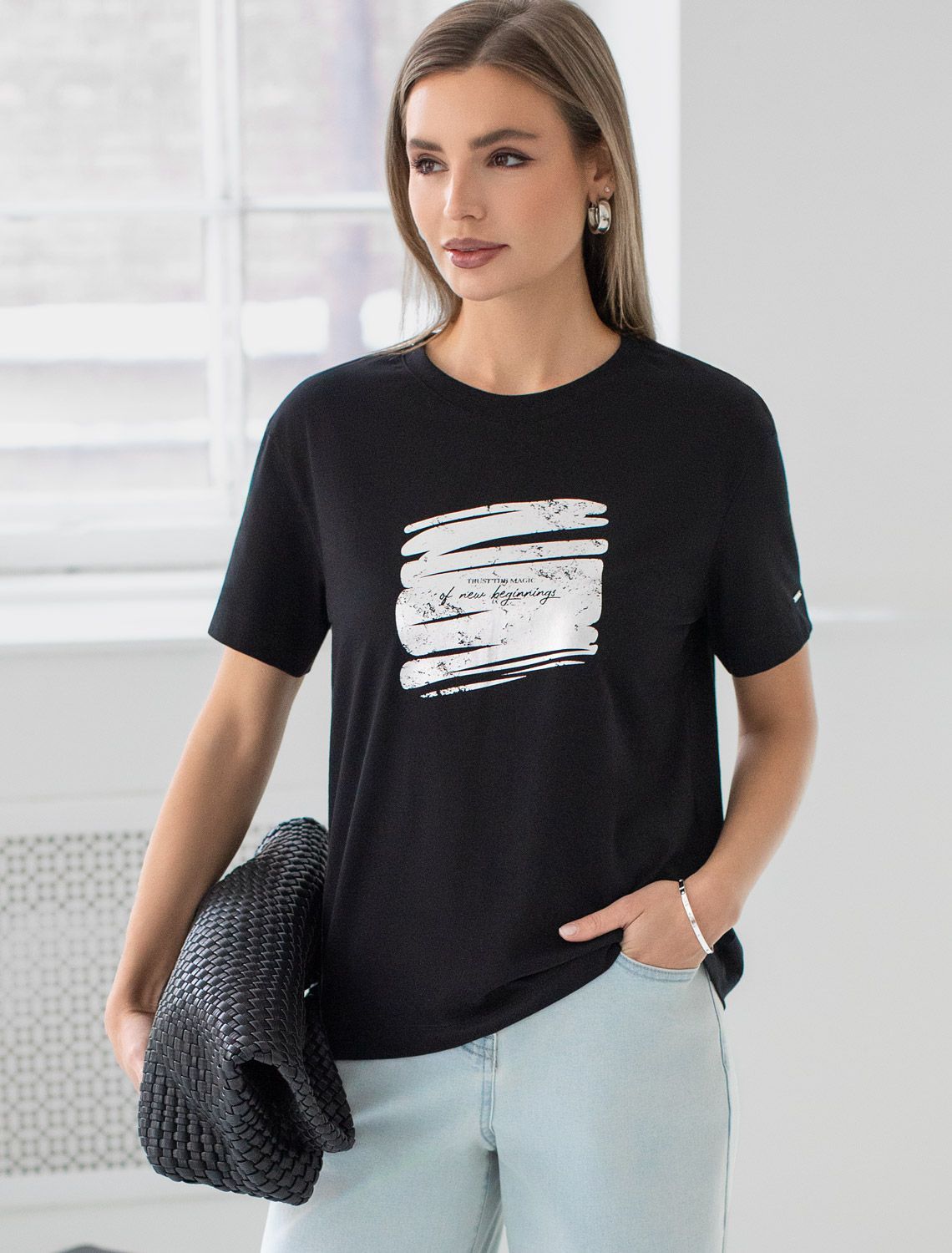 Стильная базовая футболка черного цвета с серебристым принтом фольгой выполнена из плотного хлопка с эластаном для комфортной посадки на любую фигуру. Прямая футболка классического кроя с круглым вырезом, прекрасно подходит для разных типов фигуры, в том числе и на большие размеры. Мягкость хлопка вместе с небольшой долей эластана гарантирует идеальную посадку и свободу движений. Легкая натуральная дышащая ткань премиального качества делает футболку с коротким рукавом идеальным вариантом для повседневной носки дома, на работу или офис. Однотонная футболка дополнена авторским аккуратным принтом с минималистичной надписью, который придает праздничный и элегантный вид без лишней вычурности. Блестящий принт аккуратно украшает, добавляя изысканный акцент и создавая легкий мерцающий эффект. Перевод надписи Trust the magic of new beginnings - Дооверьтесь магии новых начинаний.
