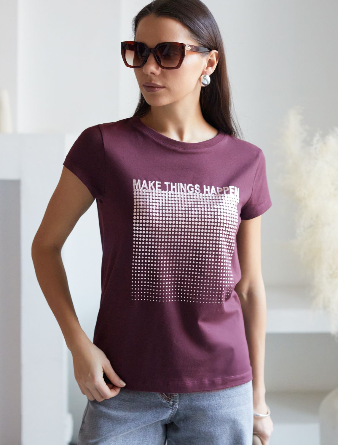 Футболка цвета бургунди идеально подходит для вечеринки и создания яркого образа. Оригинальный принт из фольги серебристого цвета придает изделию шикарный вид, который привлечет внимание на любом мероприятии. . Модель с круглым вырезом и классическим коротким рукавом обеспечивает свободу движений и комфорт в носке. Такой фасон изделия подходит на большие размеры, гармонично сидит на фигуре и помогает создать легкий акцент на достоинствах. Аккуратный круглый вырез красиво подчеркивает шею и делает образ элегантным, сохраняя актуальность для разных случаев — от рабочих встреч до вечерних прогулок и праздничных мероприятий.