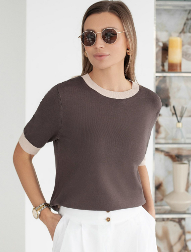 Легкий джемпер кофейного цвета с круглым вырезом идеально подходит на весну и лето. Тонкая вязка из вискозы дарит приятный комфорт и ощущение свежести в теплую погоду. Полуприлегающий крой подчеркивает силуэт, а универсальная длина позволяет сочетать джемпер с разными элементами гардероба. Контрастная отделка с мягким люрексом добавляет стильный акцент, создавая выразительный образ. Деликатное мерцание придает праздничное настроение, но не выглядит слишком ярко или вызывающе. Такой элемент украшения позволяет носить нарядный джемпер и на особых мероприятиях. Джемпер отлично смотрится на больших размерах благодаря продуманному крою и полуприлегающему фасону. Этот джемпер с коротким рукавом станет незаменимой частью гардероба в сезоны, когда хочется легкости и элегантности одновременно. Лаконичный дизайн обеспечивает простоту комбинирования с другими вещами и будет универсальной базой для создания разнообразных комплектов — от офисного до непринужденного городского стиля.