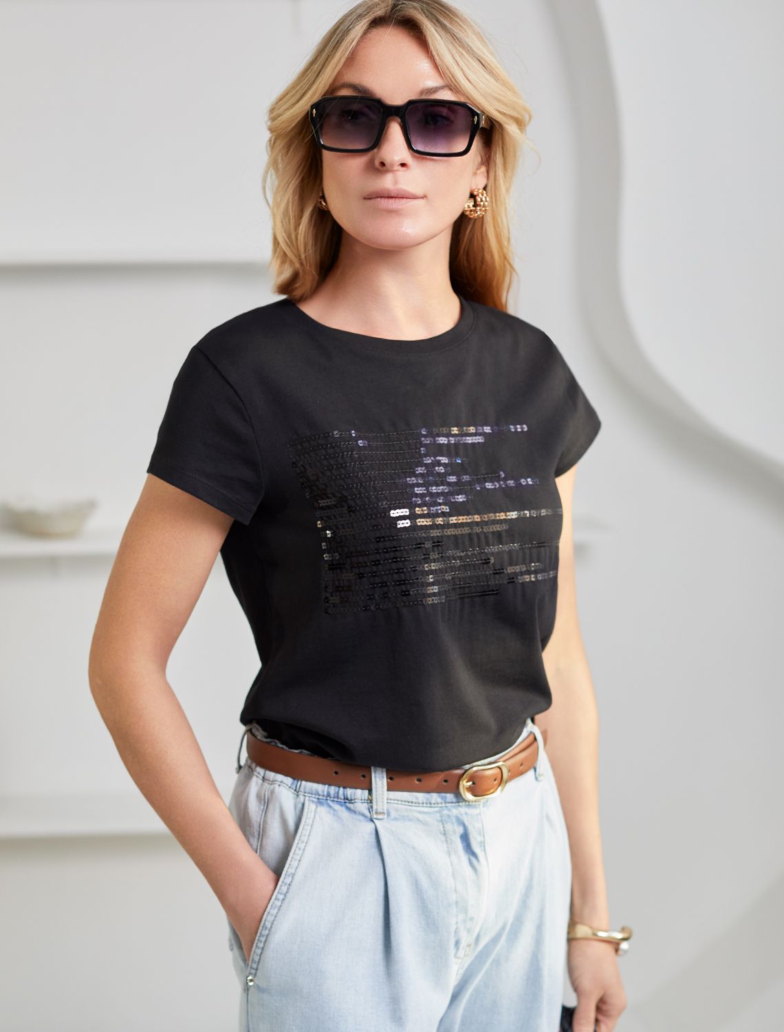 Футболка черного цвета идеально подходит для вечеринки и создания яркого образа. Оригинальный принт из пайеток придает изделию шикарный вид, который привлечет внимание на любом мероприятии. Модель с круглым вырезом и классическим коротким рукавом обеспечивает свободу движений и комфорт в носке. Такой фасон изделия подходит на большие размеры, гармонично сидит на фигуре и помогает создать легкий акцент на достоинствах. Аккуратный круглый вырез красиво подчеркивает шею и делает образ элегантным, сохраняя актуальность для разных случаев — от рабочих встреч до вечерних прогулок и праздничных мероприятий.