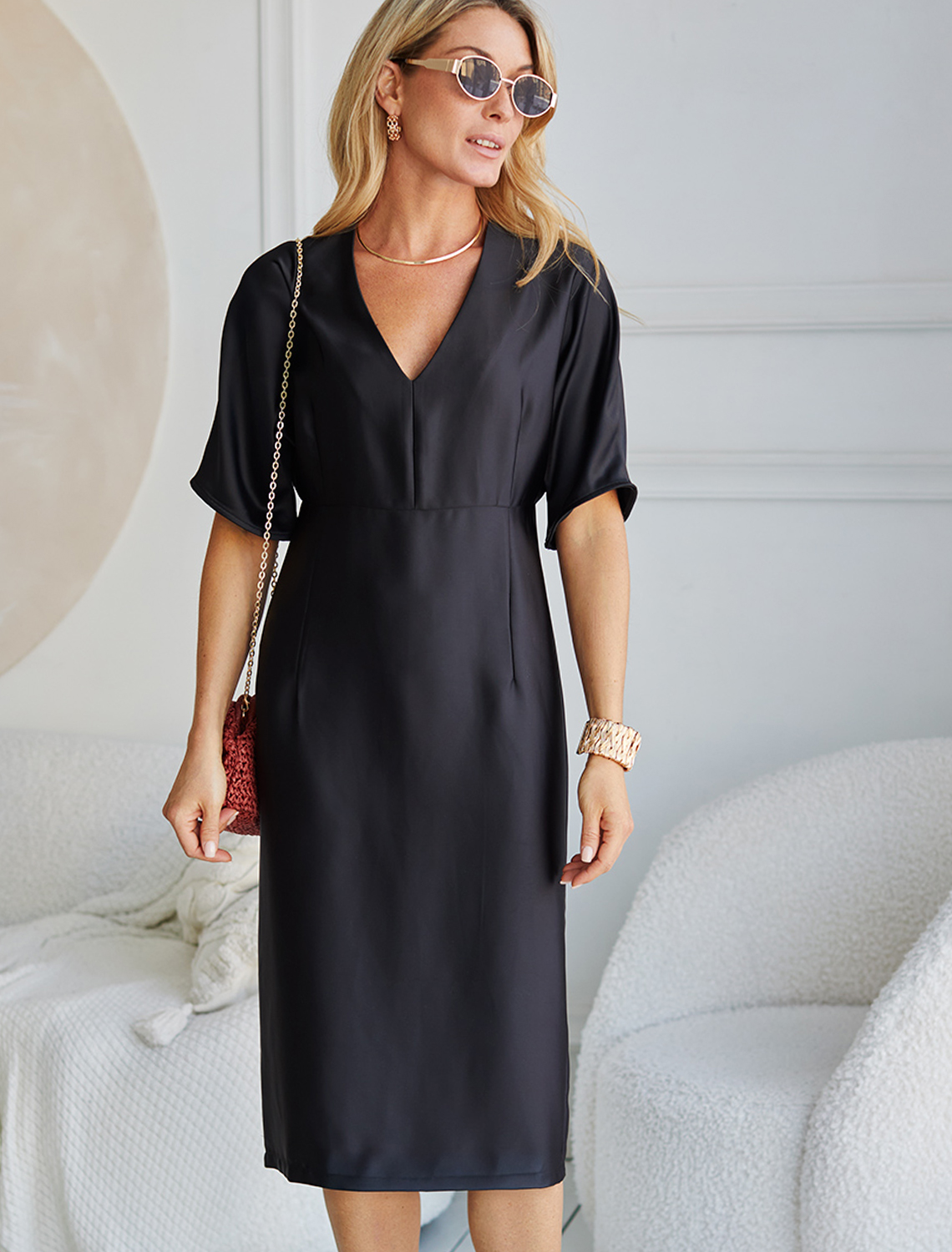 Платье с глубоким V-вырезом и рукавом «летучая мышь» выполнено из тончайших нитей плотного сатина, плетение которых создает полуматовый блеск, напоминающий натуральный шёлк. Модель с длинными глубокими вытачками спереди и сзади выглядит скульптурно, но за счет струящейся ткани сохраняется плавность силуэта. Ткань почти не мнется и имеет легкий вес. Комфортная длина ниже колена и застежка на молнию.