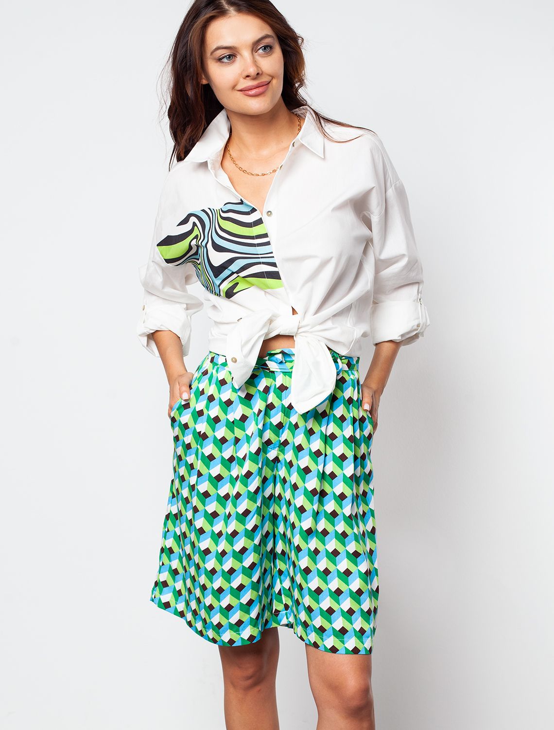 100%Вис Шорты-бермуды сшиты из премиальной вискозы. Приятная на ощупь тонкая ткань охлаждает кожу и успокаивающе действует на нее, а крой не ограничивает свободу движений. Модель дополнена поясом-лентой и карманами по бокам.