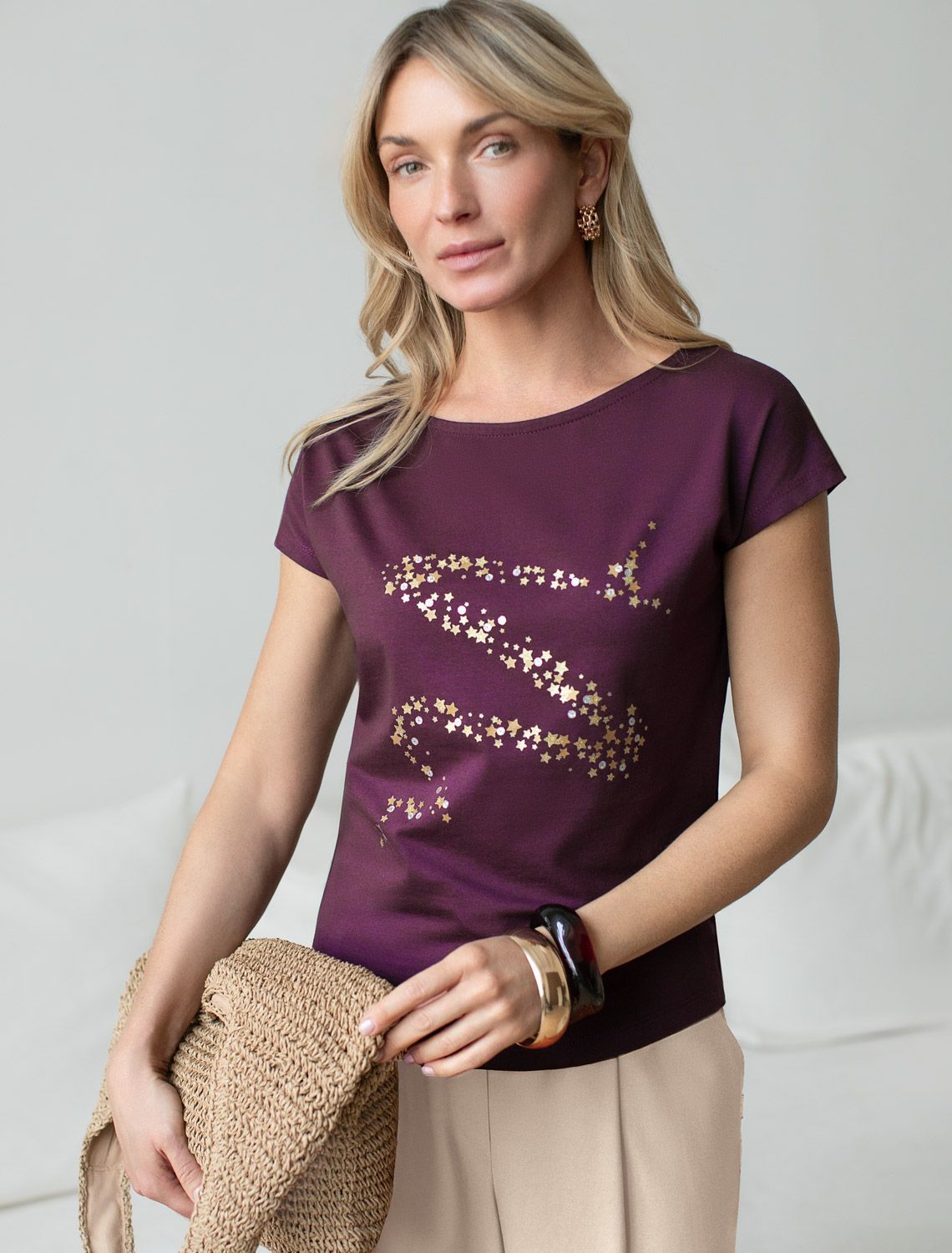 Футболка цвета бургунди идеально подходит для вечеринки и создания яркого образа. Оригинальный блестящий принт из устойчивой фольги в виде новогоднего символа змеи золотистого цвета придает изделию шикарный вид, который привлечет внимание на любом мероприятии. Модель с вырезом лодочка и цельнокроеным коротким рукавом обеспечивает свободу движений и комфорт в носке. Такой фасон изделия подходит на большие размеры, гармонично сидит на фигуре и помогает создать легкий акцент на достоинствах. Аккуратный вырез лодочка красиво подчеркивает шею и делает образ элегантным, сохраняя актуальность для разных случаев — от рабочих встреч до вечерних прогулок и праздничных мероприятий.