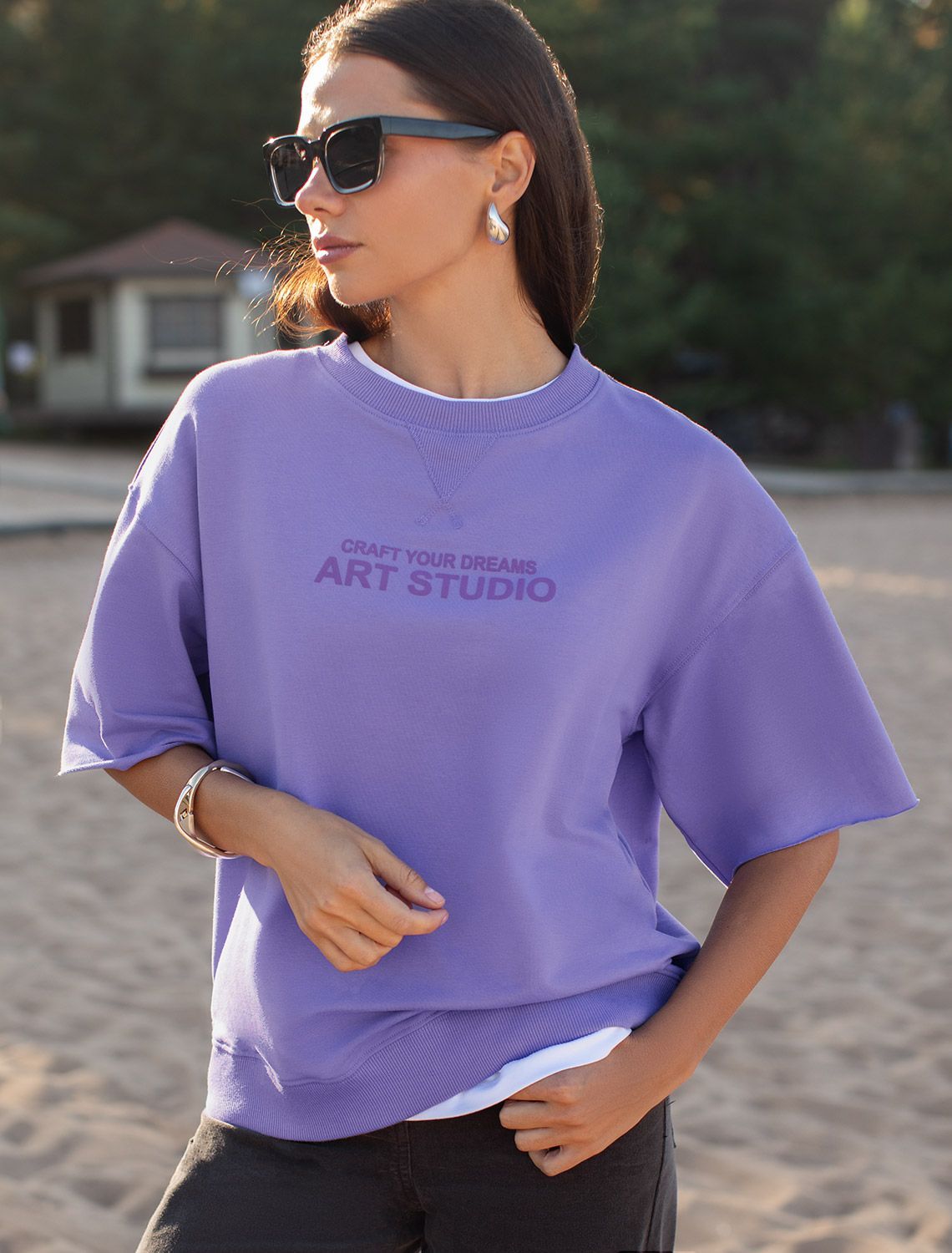Рост 172, бюст 88, талия 64, бедра 88 Перевод принта: Craft your dreams, art studio - стань скульптором своей мечты. Футболка свободного кроя со спущенным плечом выполнена из футера двухнитки с эластаном. Лаконичный принт нанесен фактурной краской. Эластичный материал гарантирует комфорт и формоустойчивость. Сочетается в костюме с брюками D44.138, D44.139 и шортами D48.008. Изделие дополнено металлическим логотипом бренда.