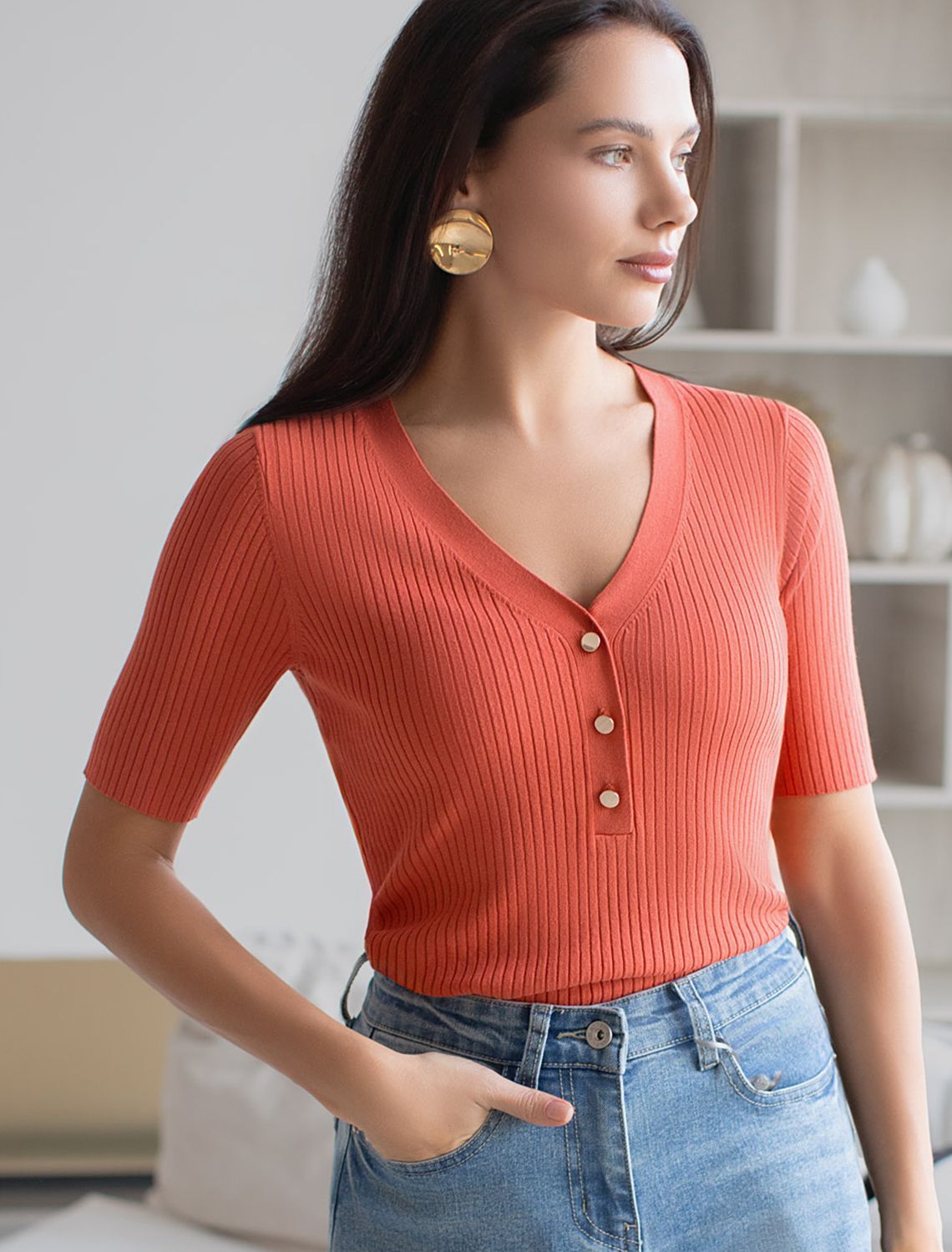 Рост 170, бюст 83, талия 64, бедра 88 Джемпер тонкой вязки из вискозы с нейлоном. Для производства изделия использована пряжа сердечникового прядения — когда нейлоновая нить (основа) обвивается вискозой. Вискоза обеспечивает приятную тактильность и гигроскопичность, а нейлон предотвращает растяжение и повышает устойчивость к пилингуемости. Модель с V- вырезом прилегающего силуэта дополнена золотистыми пуговицами. Изделие дополнено фирменным металлическим логотипом бренда.