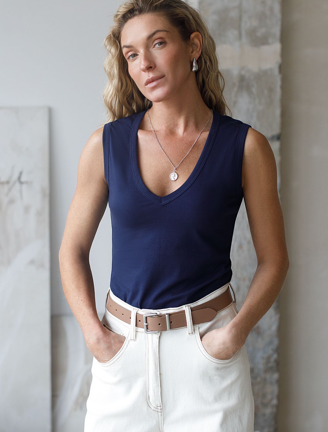 Топ выполнен из премиального хлопка с эластаном. V- вырез подчеркивает линию декольте и визуально вытягивает шею. Лаконичная базовая модель впишется в любой гардероб и дополнит многослойные образы. Материал изделия хорошо тянется и гарантирует идеальную посадку по фигуре. Топ украшен металлическим логотипом бренда.