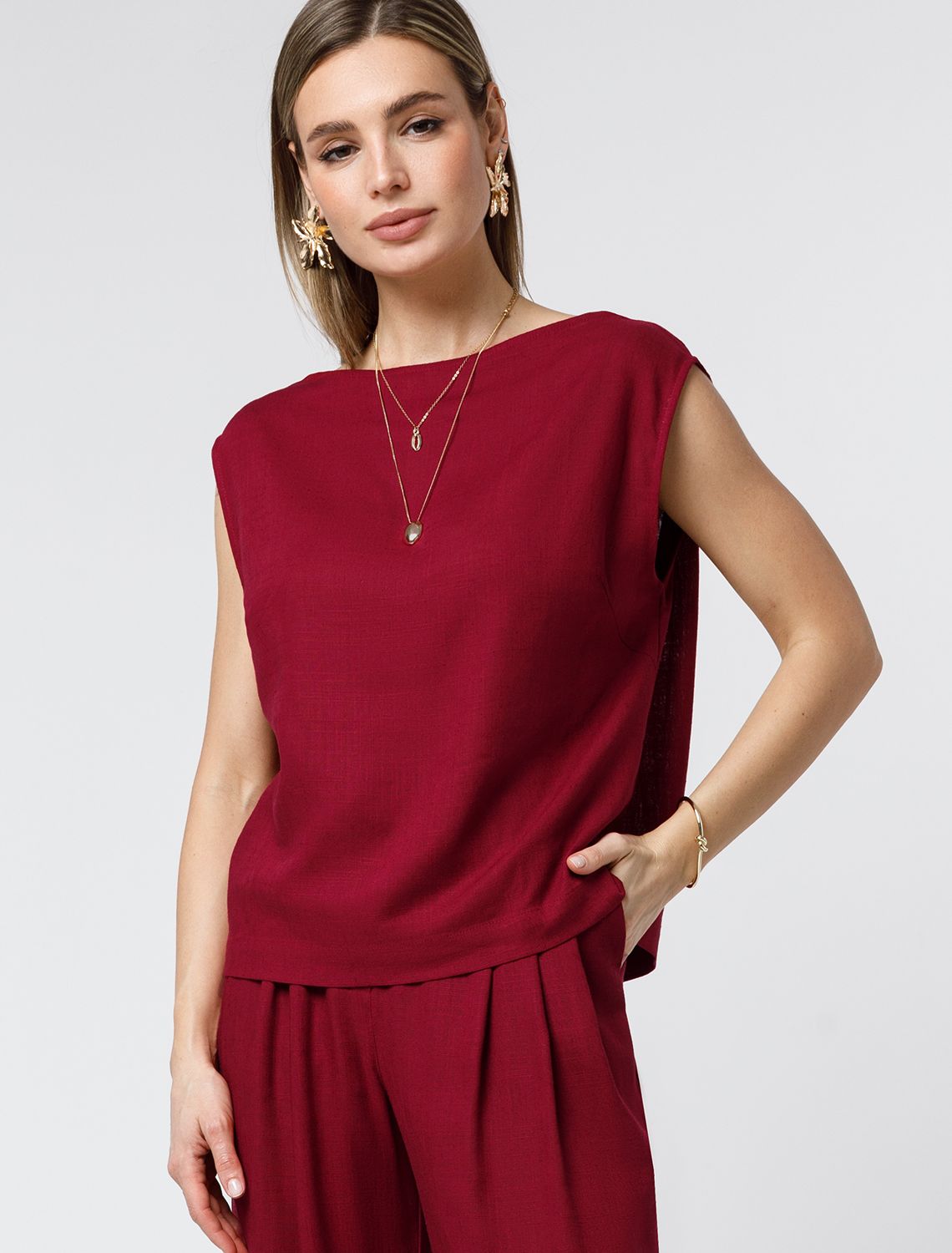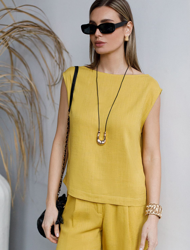 Состав: 70%Вис 30%Лен Параметры м..показатьодели на первом фото: Рост 170, бюст 89, талия 63, бедра 92Лаконичный топ выполнен изо льна с вискозой. Изделие с горловиной формы лодочка, без застежек. Лён в составе обеспечивает прочность и воздухопроницаемость, вискоза эластичность и гладкость ткани. Благодаря такому сочетанию изделие хорошо драпируется, меньше мнется и сохраняет форму в течении долгого времени. Сочетается в костюме с брюками D24.222 и шортами D28.052одели на первом фото: Рост 170, бюст 89, талия 63, бедра 92