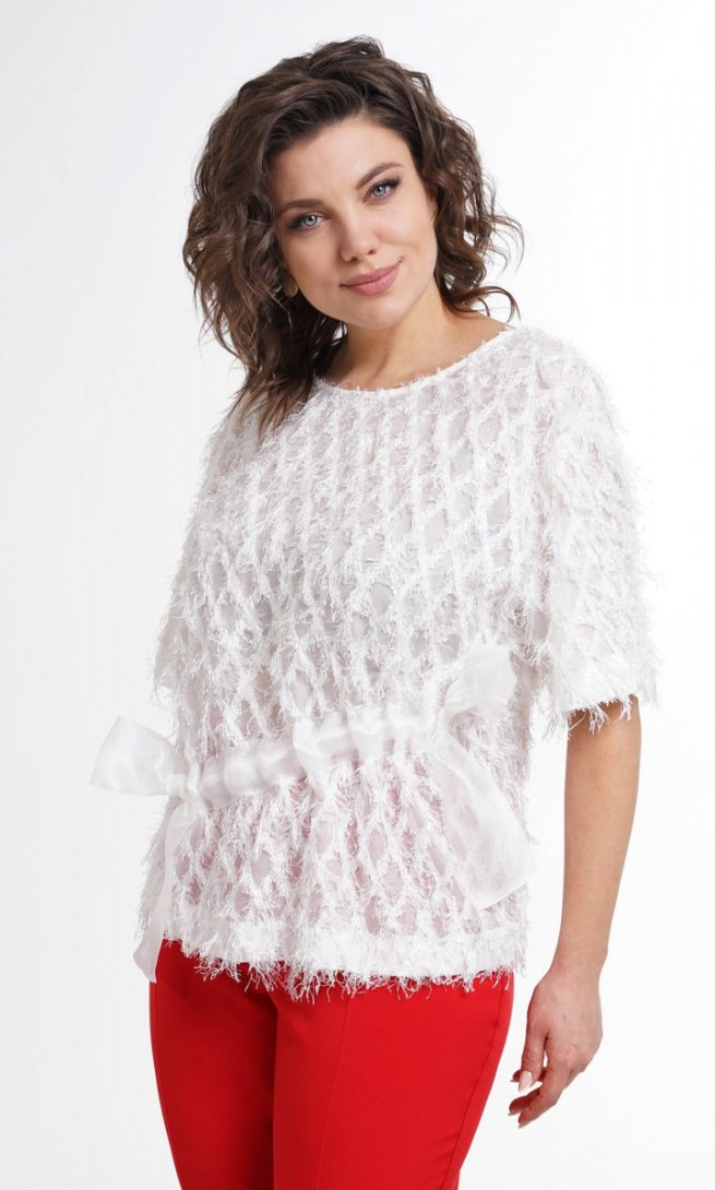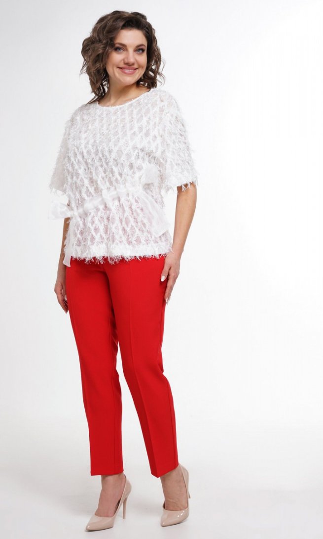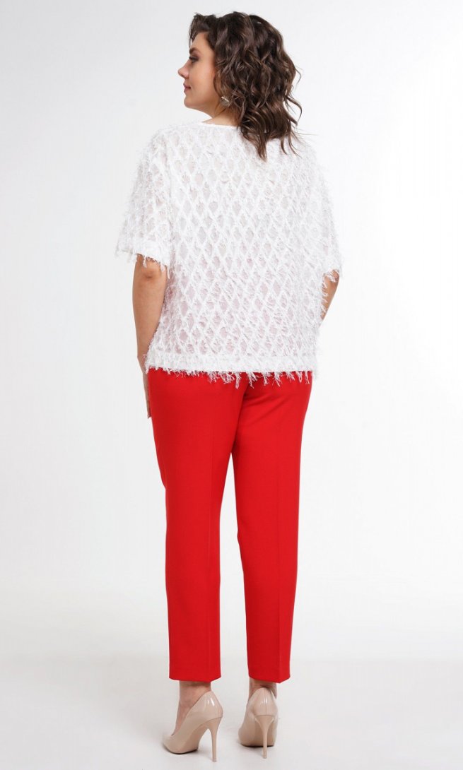 Блуза прямого, свободного силуэта, со спущенной линией плеча, с втачными одношовными, короткими рукавами. По переду степень прилегания фиксирует отделочная кулиса с завязкой. Брюки прямого силуэта, на притачном поясе (Р52; 54; 56 с резинкой по боковым), с застёжкой типа «гульфик» на молнию и по краю пояса на петлю, пуговицу. Передние части с талевыми выточками, с косыми боковыми карманами. Задние части с талевыми выточками.