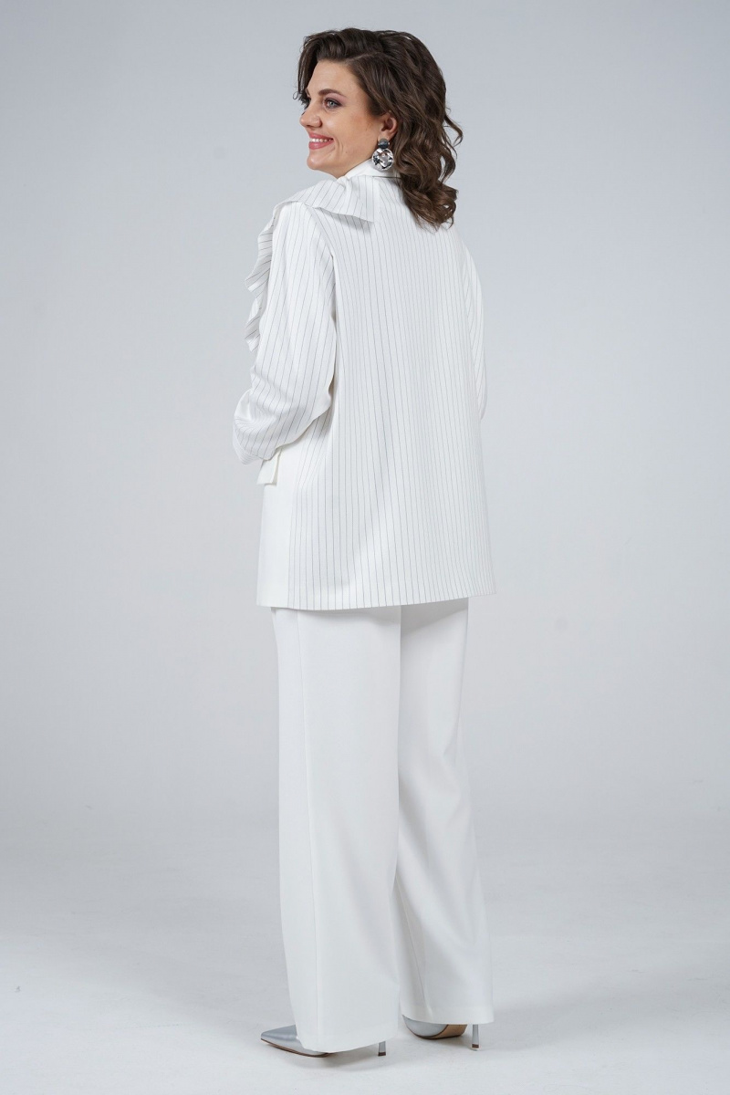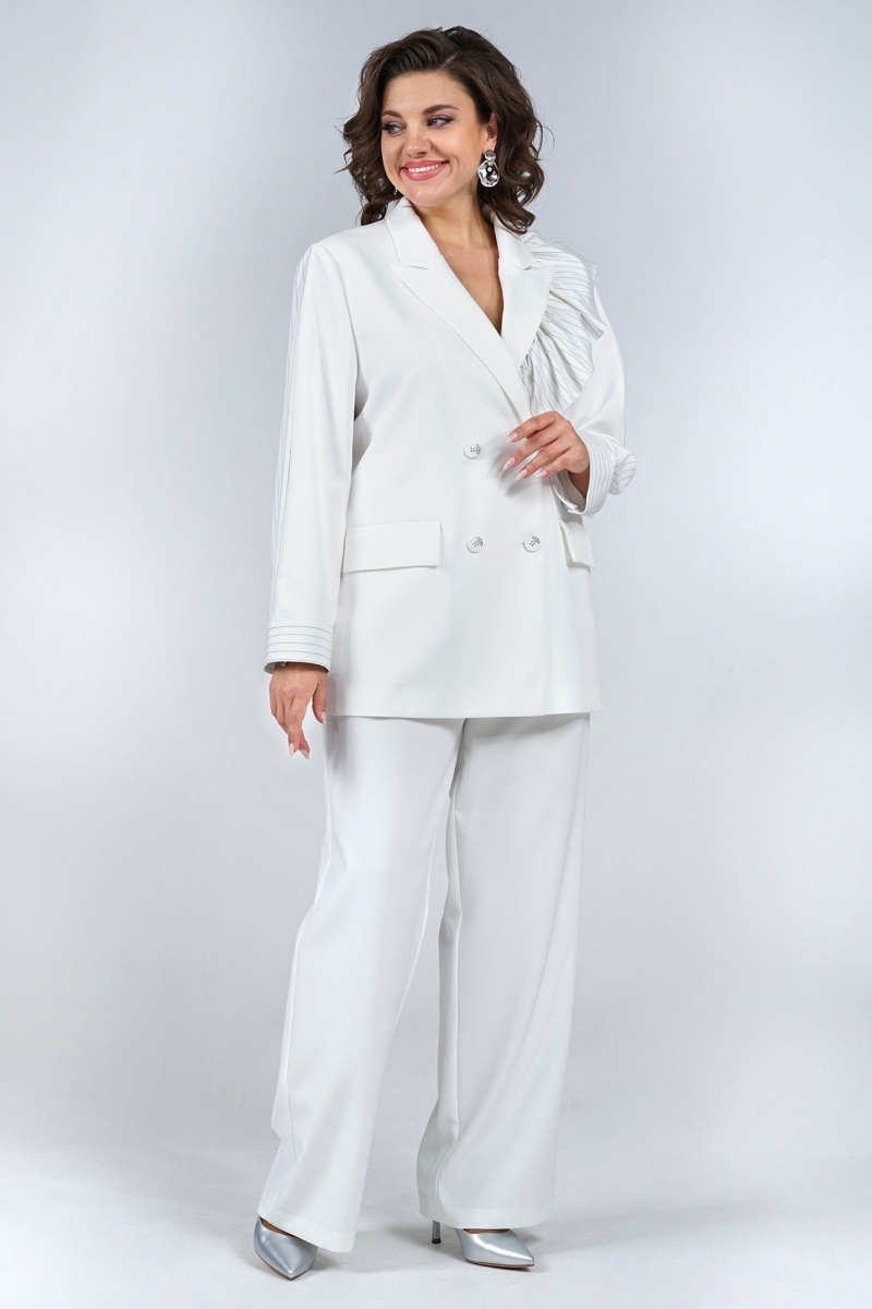 Жакет прямого, свободного силуэта, с двух-бортной застёжкой на петли и пуговицы и с в внутренней застёжкой на петлю и пуговицу, перед и спинка на подкладке, по левой стороне декорирован съёмной оборкой пристёгивающаяся под лацканом на пришивные кнопки.