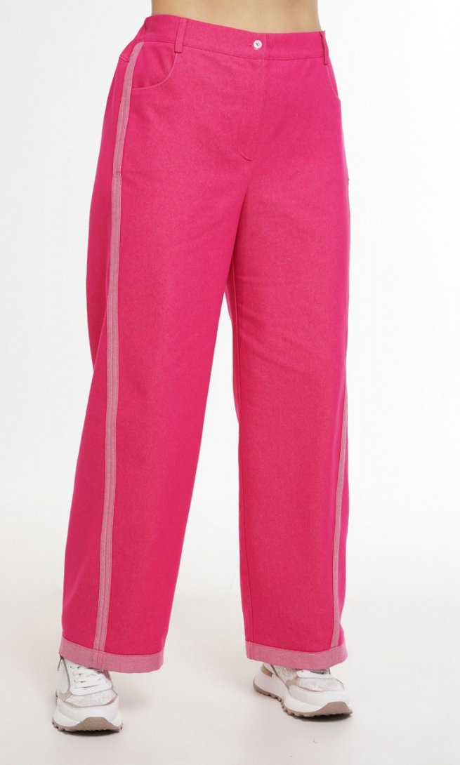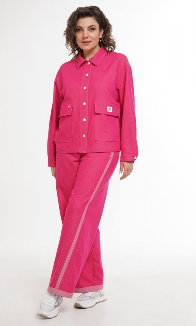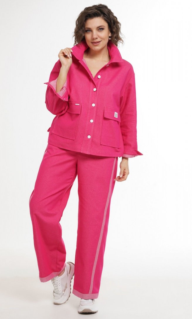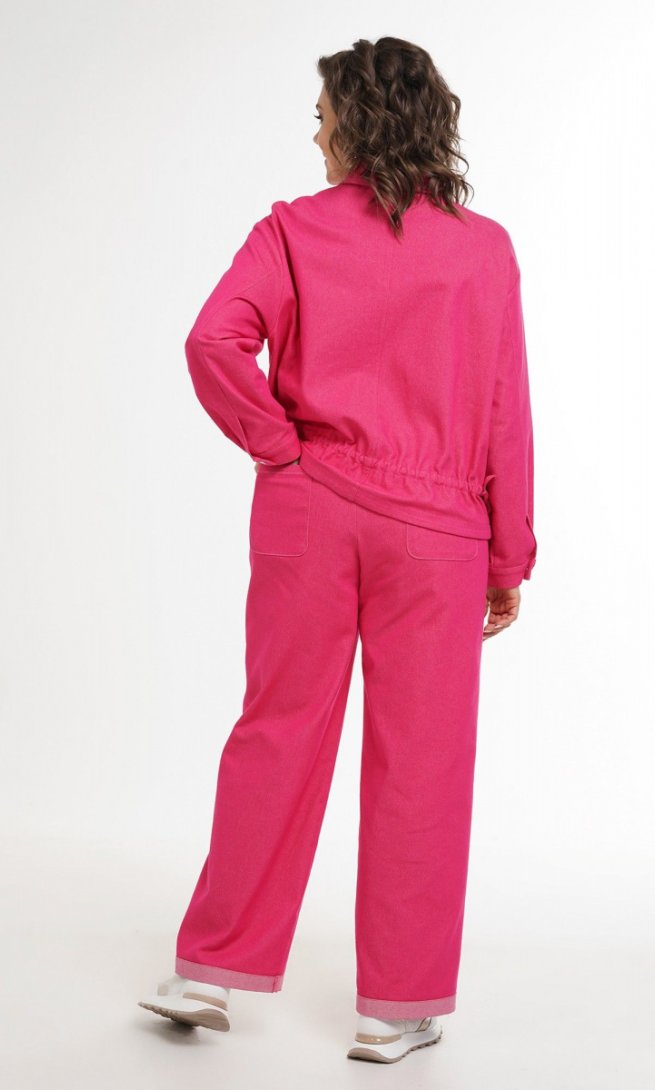 КОМПЛЕКТ. Жакет прямого силуэта, со спущенной линией плеча, с застёжкой по притачной планке на пробивные петли и пуговицы. Перед с накладными карманами с клапаном, клапаны декорированы пришивными нашивками. Спинка со средним швом, чуть ниже линии талии кулиса и завязка фиксируемая степень прилегания. Рукава втачные, двухшовные, понизу с разрезом, мягкой складкой и притачными манжетами на пробивную петлю и пуговицу. Воротник отложной. Брюки прямого, свободного силуэта, с притачным поясом со шлёвками, по боковым на резинке, с застёжкой типа «гульфик» на молнию и по краю пояса на пробивную петлю и пуговицу. С переходящими боковыми швами на перед с закрытым срезом на лица. Передние части с фигурными боковыми карманами. Задние части с кокеткой и накладными карманами. Понизу имитация цельнокроеной манжеты.