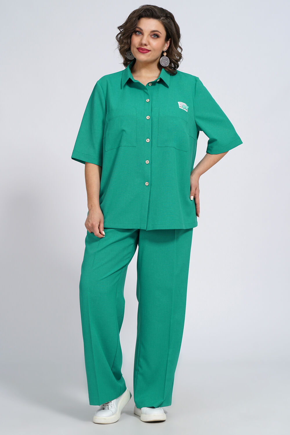 Ткань плательно-костюмного ассортимента,лен-вишер.Блуза женская прямого, свободного силуэта, с центральной застёжкой по цельнокроеной планке на петли и пуговицы. Декорированная нашивкой верху левого накладного кармана.