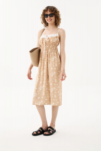 Топ полуприлегающего силуэта, на широких бретелях. Перед с нагрудными выточками. С фигурной линией по горловине переда.
