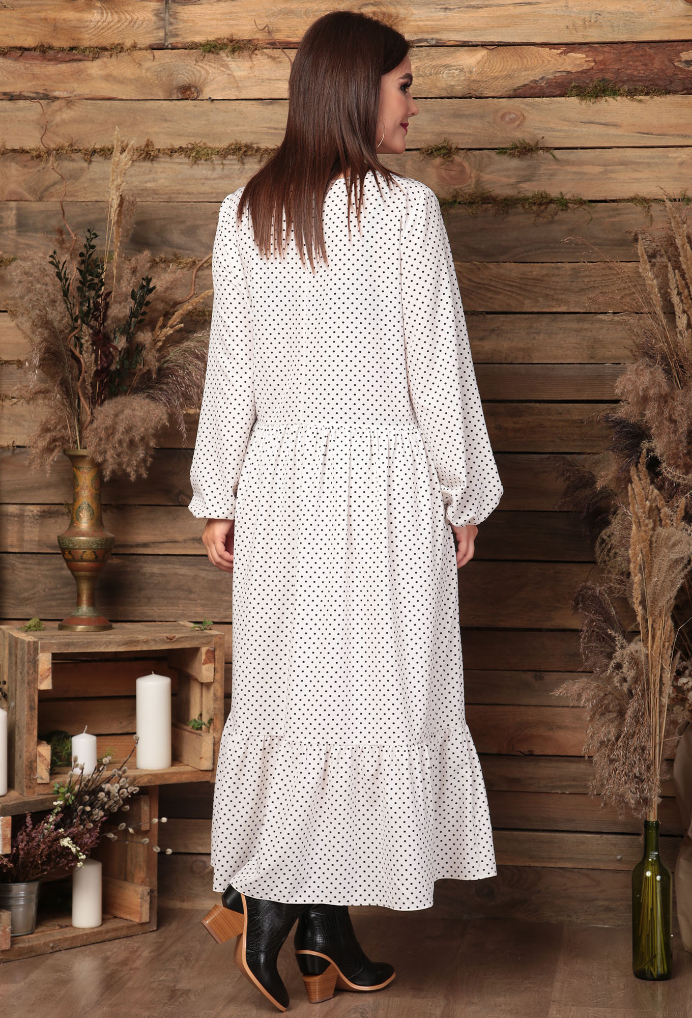 Платье женское из текстильной ткани в горошек. Платье отрезное по линии талии, юбка присобрана, на подкладке. По полочке идут выточки. Горловина овальной формы, окантована. Рукав втачной,одношовный длинный. По низу рукава резинка.По низу платья широкий присобранный волан.