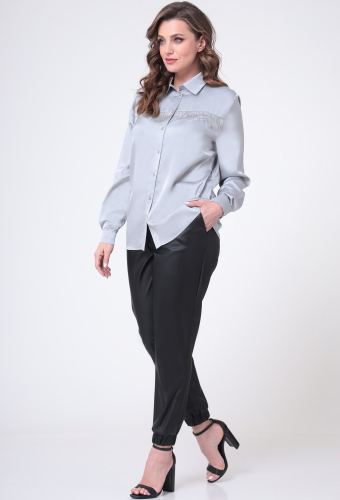 Блузка прямого силуэта, выполнена из однотонной ткани. Перед блузки с отрезной плечевой кокеткой, нагрудными вытачками и центральной застежкой на петли и пуговицы. Горловина круглой формы с воротником рубашечного типа на отрезной стойке. Рукав длинный, втачной, одношовный со складками. Низ рукава обработан притачной манжетой с застежкой на петли и пуговицы. Спинка цельная. По шву стачивания переда с кокеткой обработана тесьма.