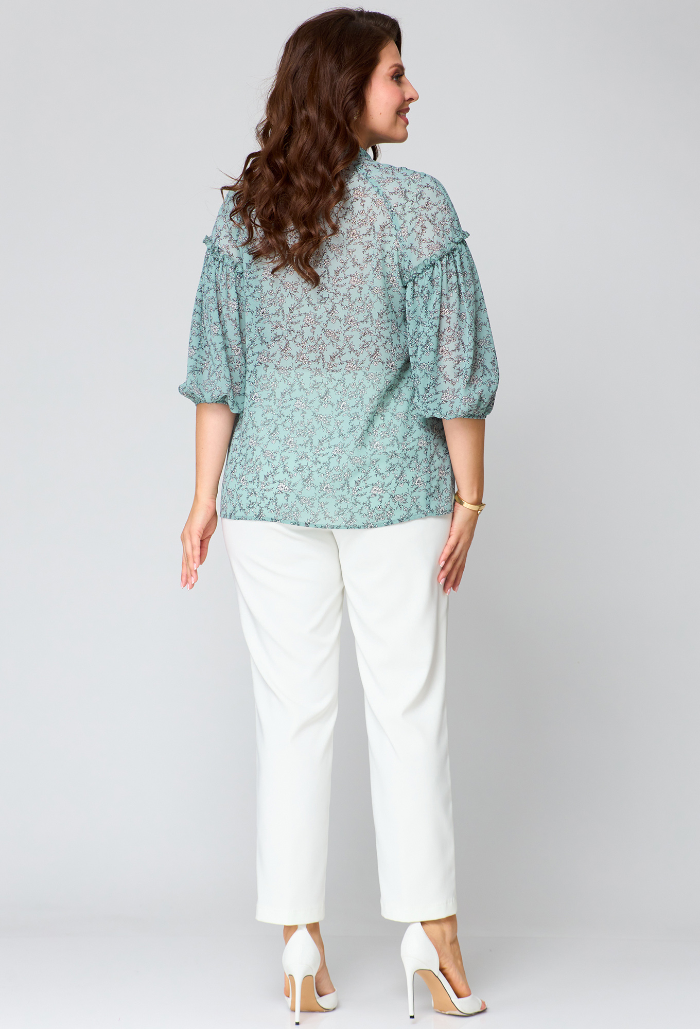 Блузка прямого, свободного силуэта, выполнена из шифона с набивным рисунком. Полочка блузки с центральной застежкой по планке на петли и пуговицы, с нагрудными вытачками. Горловина круглой формы, обработана воротником-стойкой. Спинка цельная. Рукав реглан, состоящий из верхней и нижней частей. Нижняя часть рукава со сборкой в виде рюши. По низу рукав на резинке.
