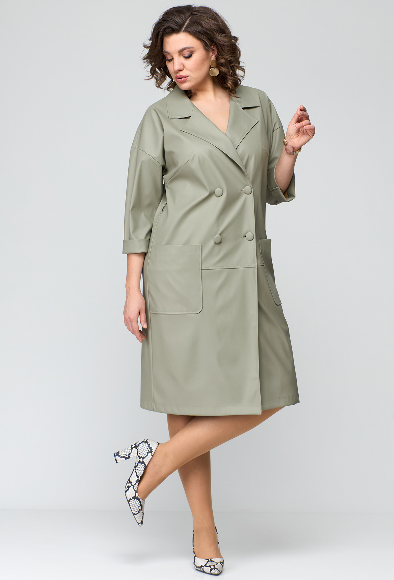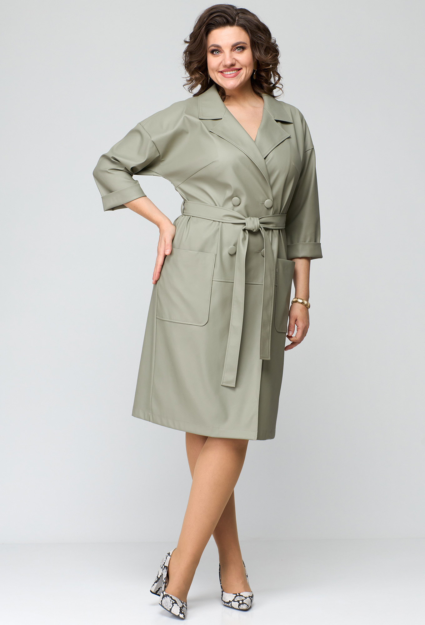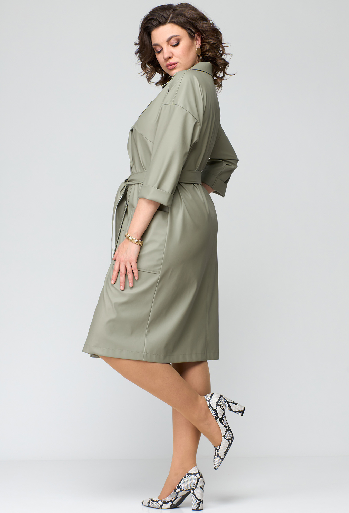 Платье прямого силуэта, выполнено из экокожи. Полочка с нагрудными вытачками, по нижней части разрезная с накладными карманами. Застежка двубортная на четыре петли и пуговицы. Горловина V-образной формы с отложными лацканами и воротником пиджачного типа. Спинка со средним швом. Пройма углубленной формы, рубашечного типа. Рукав длиной 3\4, по низу с цельнокроеной отложной манжетой. В области талии по боковым швам настрочены шлевки, через которые продет пояс, завязывающийся спереди.