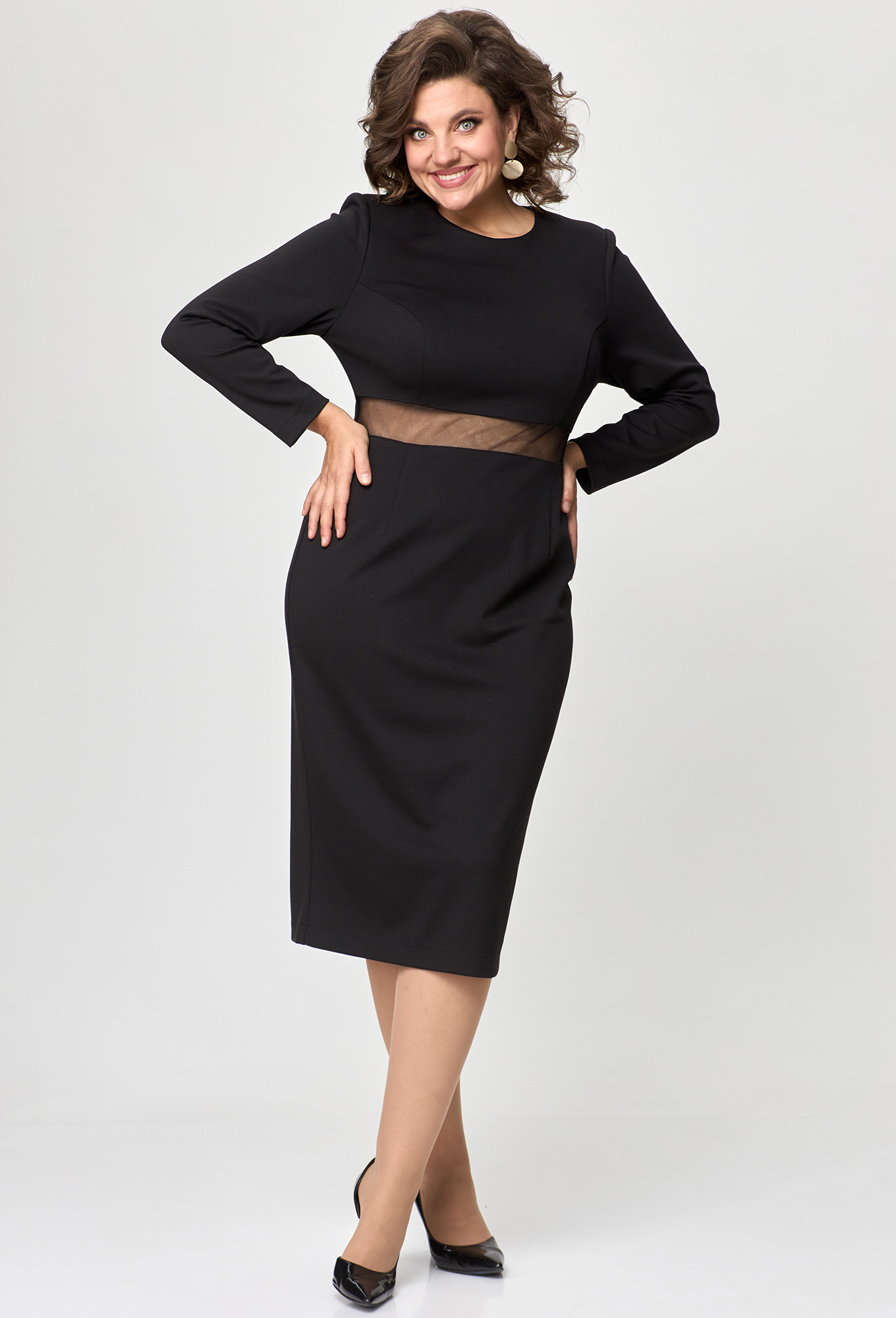 Платье прилегающего силуэта, длиной за колено выполнено из плотного однотонного трикотажного полотна, в качестве отделки использовано трикотажное полотно “сетка“.