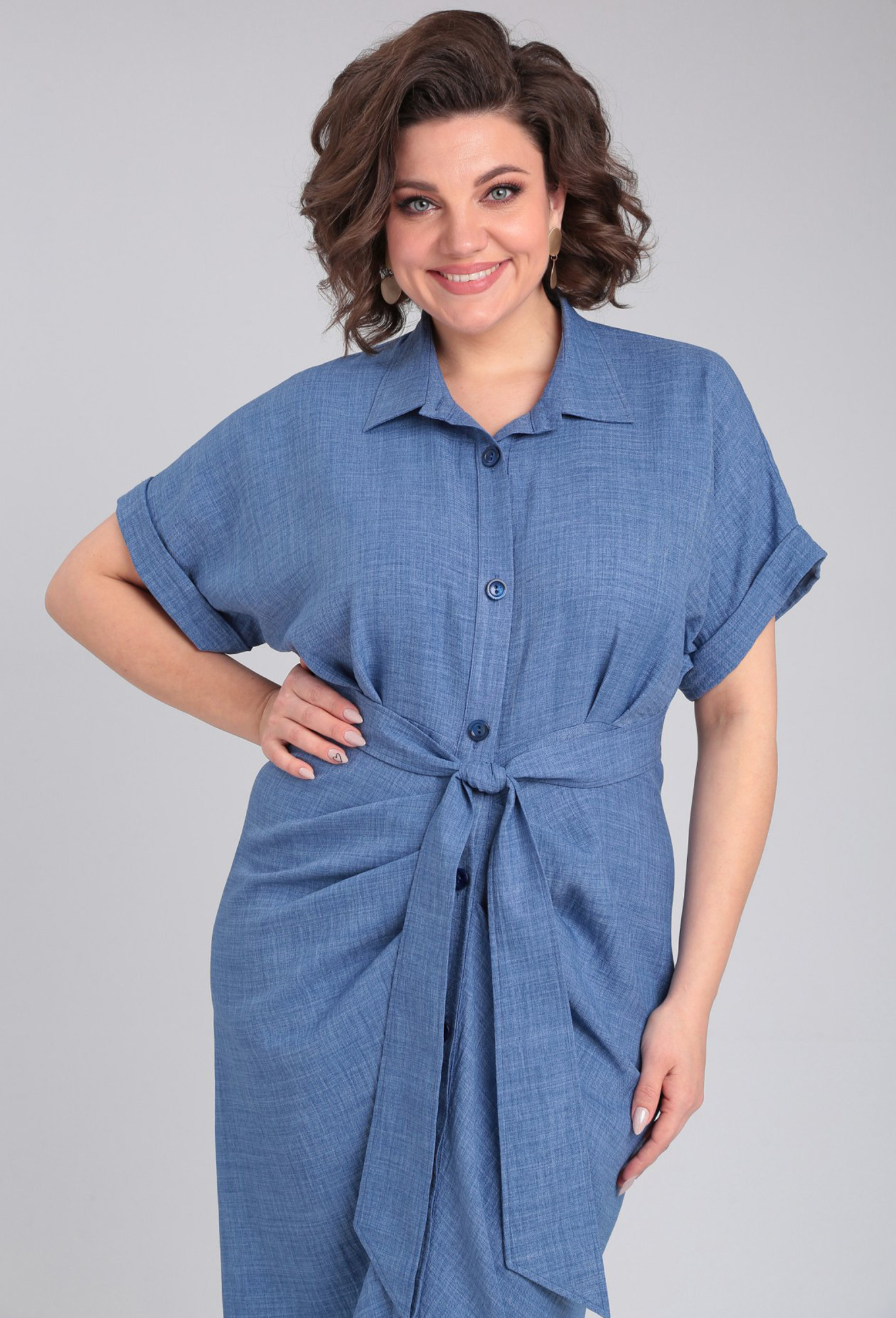 Платье выполнено из однотонной ткани. Платье отрезное по линии талии. Полочка с центральной застежкой на петли и пуговицы по притачной планке. Воротник рубашечного типа. Полочка лифа со складками по шву притачивания юбки. Спинка лифа цельная с талиевыми вытачками. Рукав цельнокроеный, длиной до локтя. По низу рукав на притачной отложной манжете. Юбка платья со средним швом по спинке и складками по центру переда. Низ юбки ассиметричный. По боковым швам в области талии обработан пояс, завязывающийся спереди. Платье длиной за колено.