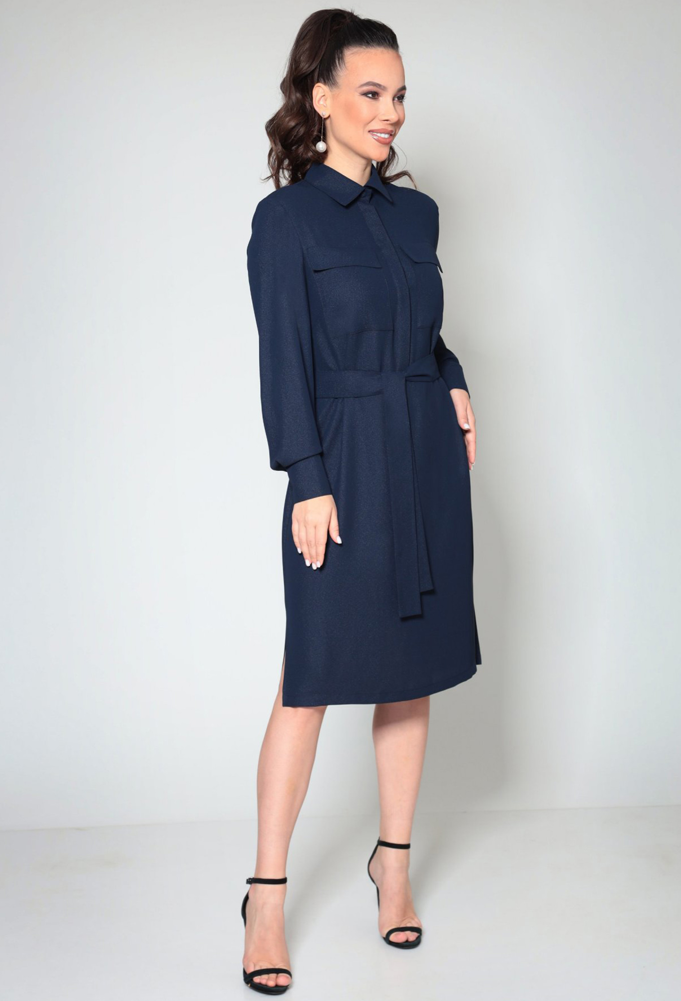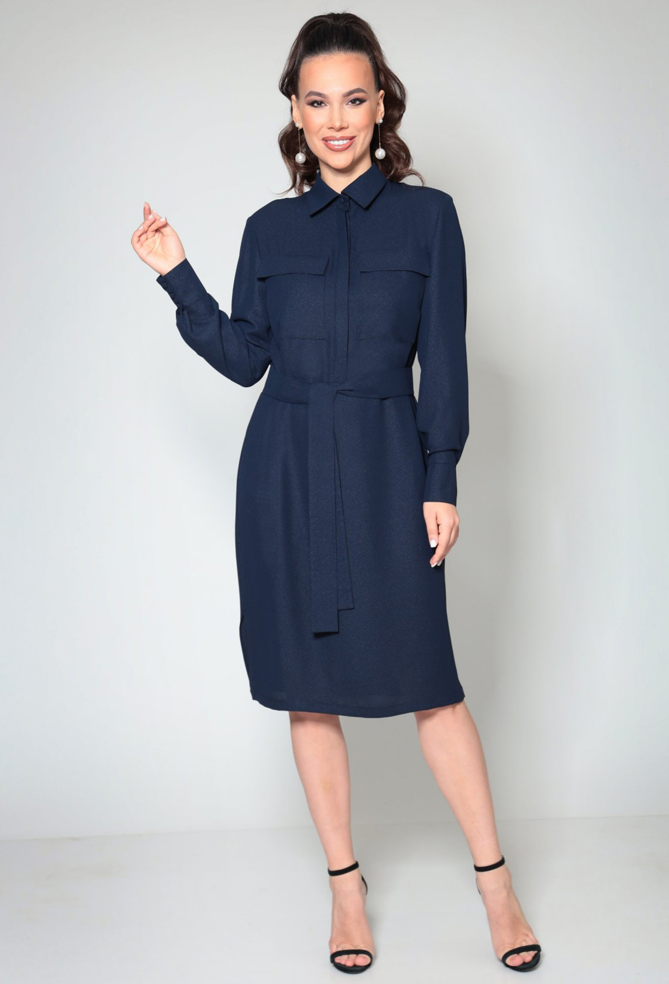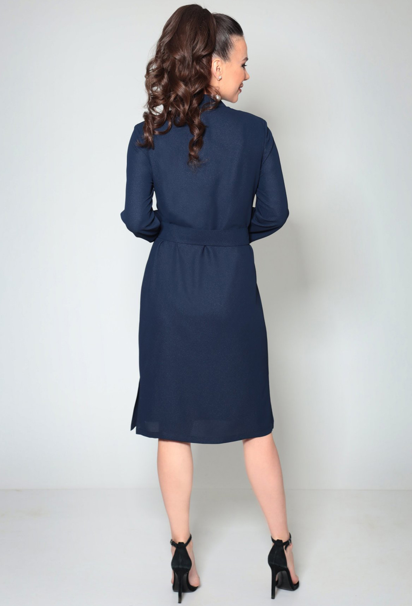 Платье прямого силуэта, длинной ниже колена, выполнено из ткани платьево-блузочной группы. Перед платья с горизонтальным швом по линии талии и потайной застежкой на петли и пуговицы. Горловина круглой формы с воротником рубашечного типа на отрезной стойке. Спинка цельная. Пройма углубленной формы, рукав рубашечного типа, одношовный, длинный. Низ рукава обработан притачной манжетой, с застежкой на петли и пуговицы.