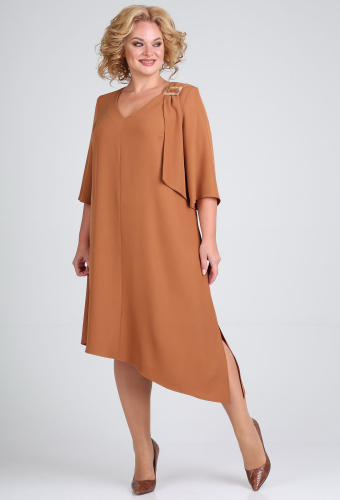 Женское платье из шифоновой ткани. Полочка платья с центральной на петли и пуговицы по притачным планкам. Лиф платья отрезной по линии талии. Полочка с нагрудными вытачками. Горловина круглой формы, обработана воротником-стойкой. Спинка лифа с талиевыми вытачками. Юбка платья формы “колокол”. В области талии по боковому шву настрочены шлевки через которые продет пояс. Рукав втачной, одношовный, длинный. По низу рукав со сборкой на притачной манжете с завязками. Платье на подкладке.