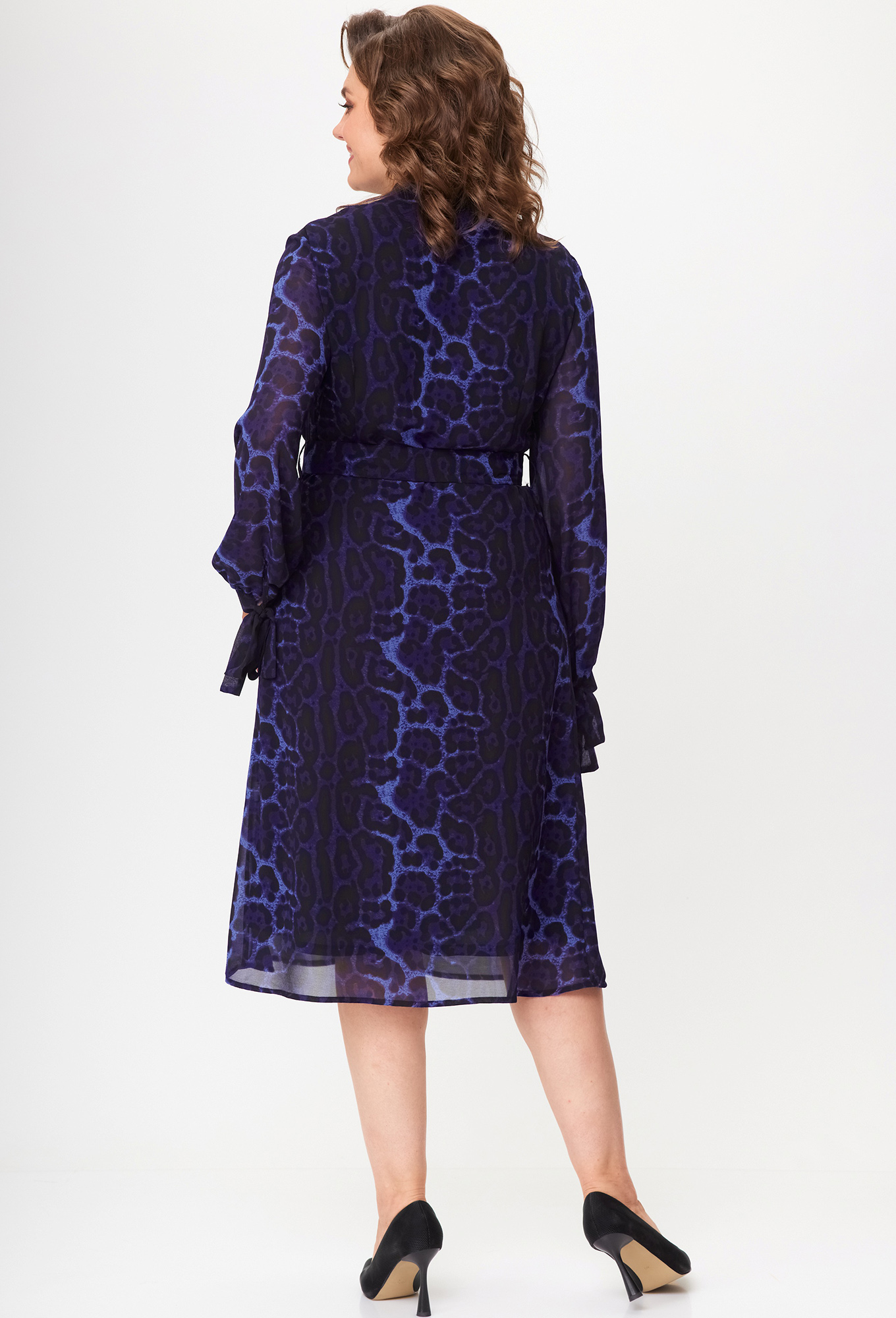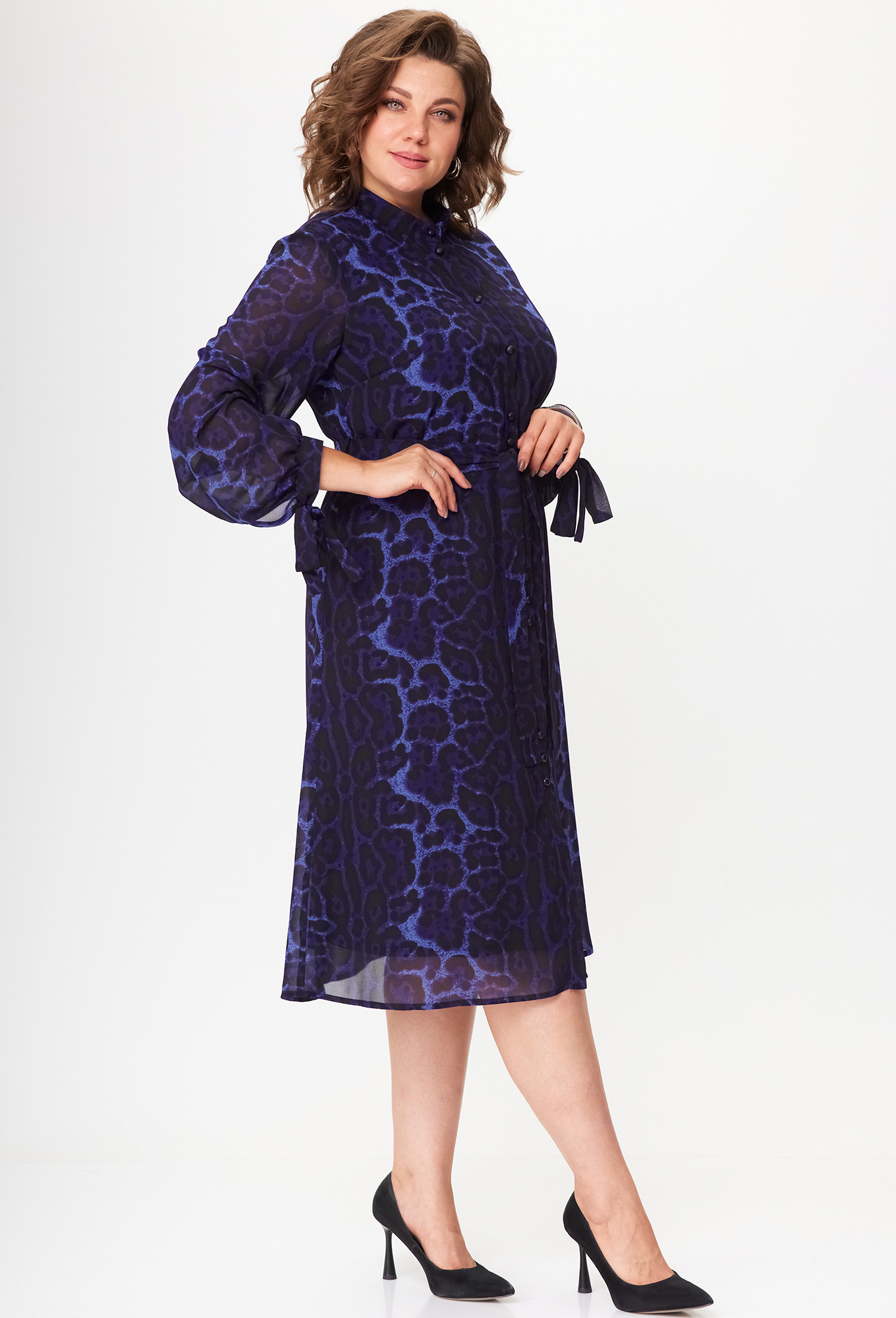 Женское платье из шифоновой ткани. Полочка платья с центральной на петли и пуговицы по притачным планкам. Лиф платья отрезной по линии талии. Полочка с нагрудными вытачками. Горловина круглой формы, обработана воротником-стойкой. Спинка лифа с талиевыми вытачками. Юбка платья формы “колокол”. В области талии по боковому шву настрочены шлевки через которые продет пояс. Рукав втачной, одношовный, длинный. По низу рукав со сборкой на притачной манжете с завязками. Платье на подкладке.