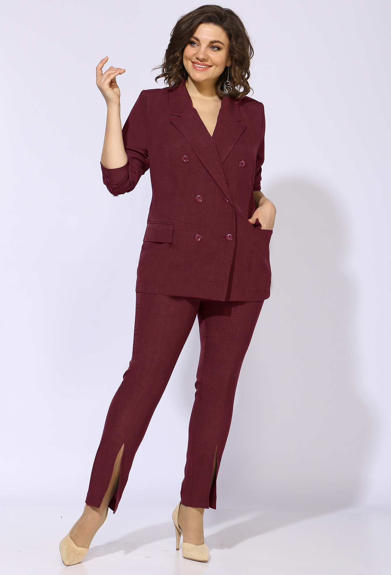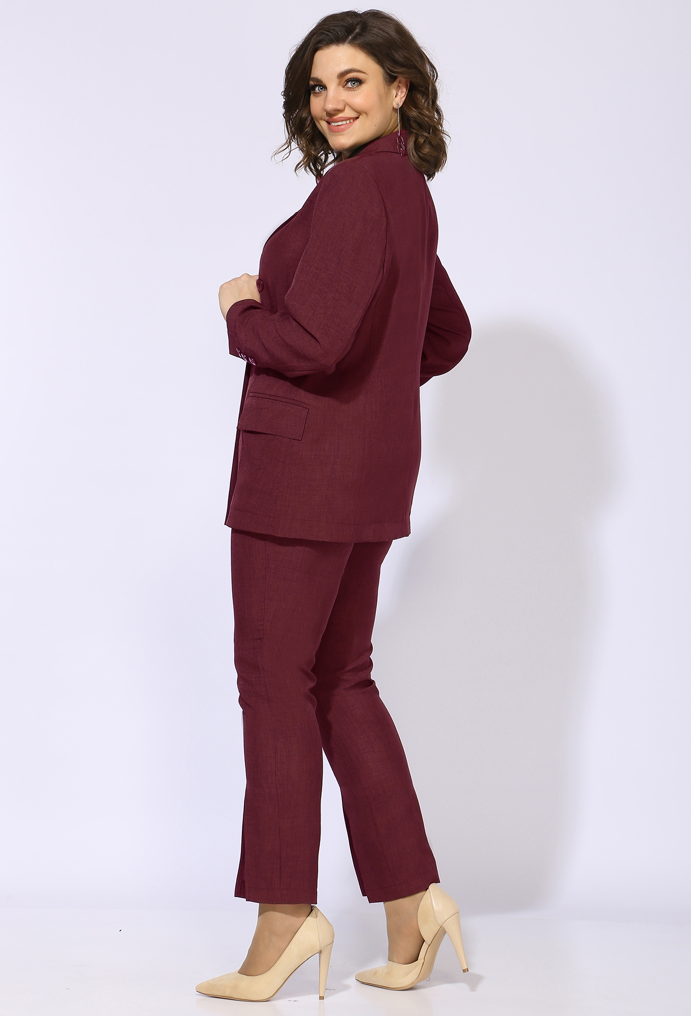 Костюм выполнен из однотонной ткани. Жакет прямого силуэта, без подклада. Перед жакета с вертикальными вытачками, двубортной застежкой на петли и пуговицы и прорезными карманами с клапанами. Жакет с отрезным бочком без бокового шва. Горловина V – образной формы, с отложными лацканами и воротником пиджачного типа. Спинка со средним швом. Рукав втачной, длинный, двухшовный, со шлицей.