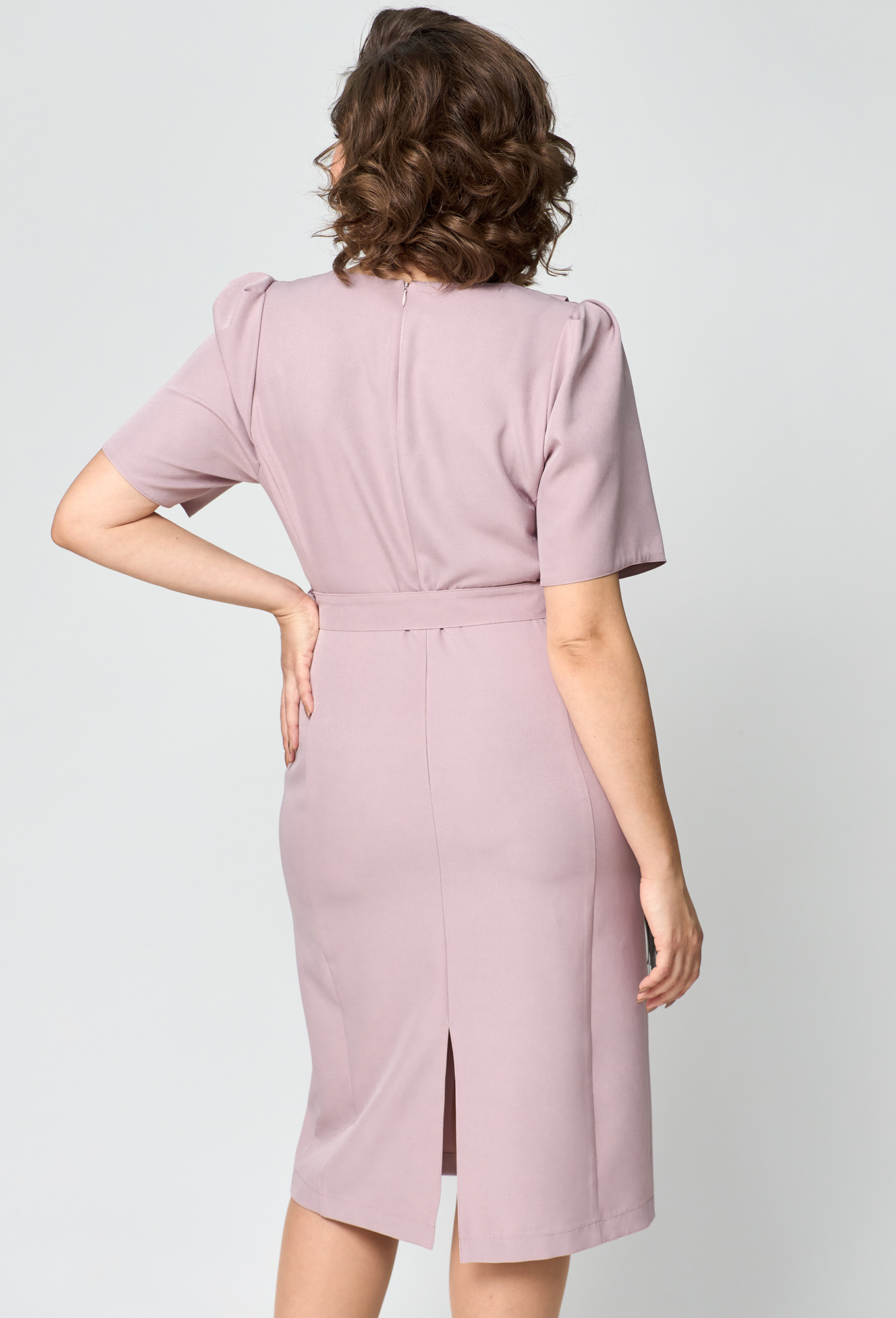 Платье полуприлегающего силуэта, длиной за колено, выполнено из однотонной ткани. Передняя часть платья состоит из верхней и нижней части платья. Нижняя часть лифа полочки с вертикальными рельефами. Верхняя левая часть со складками, правая часть в виде детали-хвоста, закрепленного в плечевой срез и пройму. Низ хвоста с декором из тесьмы. Горловина V-образной формы. Нижняя часть переда с талиевыми вытачками. Спинка со средним швом и вертикальными рельефами. В верхней части среднего шва спинки обработана потайная молния, в нижней части разрез. По боковым швам в области талии настрочены шлевки, через которые продет пояс с пряжкой. Рукав длиной до локтя, втачной, одношовный. По окату рукава обработаны складки. Платье на плечиках.