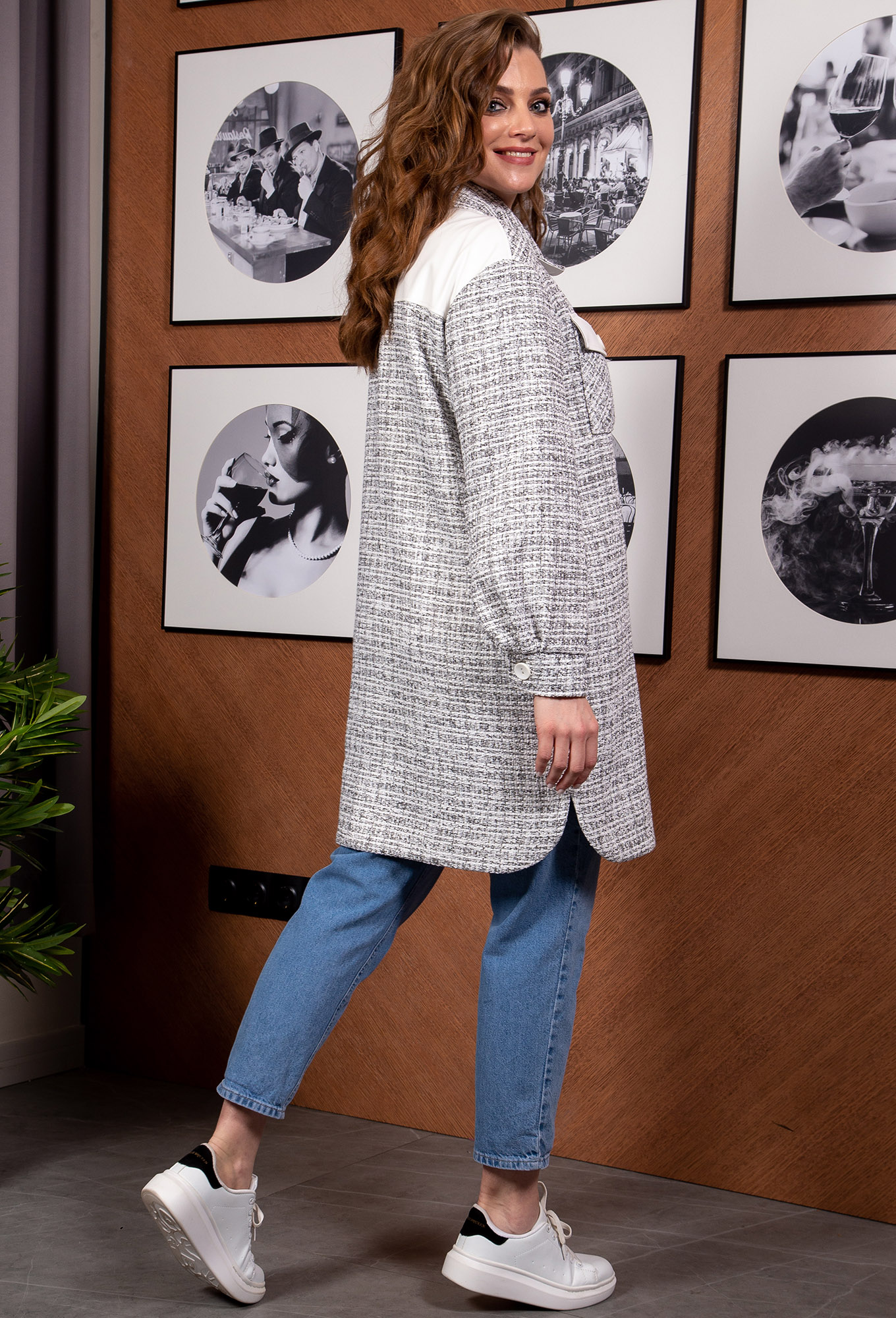 Жакет прямого силуэта, на подкладке, выполнен из пестротканой ткани типа “ шанель”. В качестве отделки использована экокожа. Полочка с центральной застежкой на петли и пуговицы. В верхней части обработаны накладные карманы с клапанами. Горловина круглой формы, воротник стояче-отложной. Спинка с отрезной кокеткой. Низ жакета с закругленными боковыми.Пройма углубленной формы, рубашечного типа .По низу рукав со складками и на притачной манжете с застежкой на петлю и пуговицу. В боковых швах обработаны прорезные карманы.