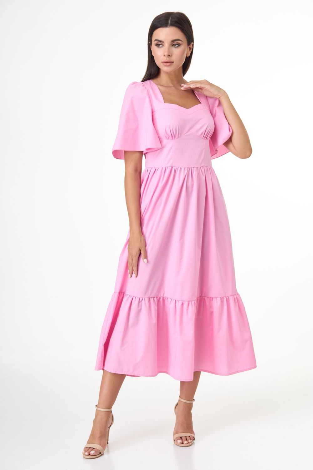 Платье длины миди, полуприлегающего силуэта, отрезное по линии талии.