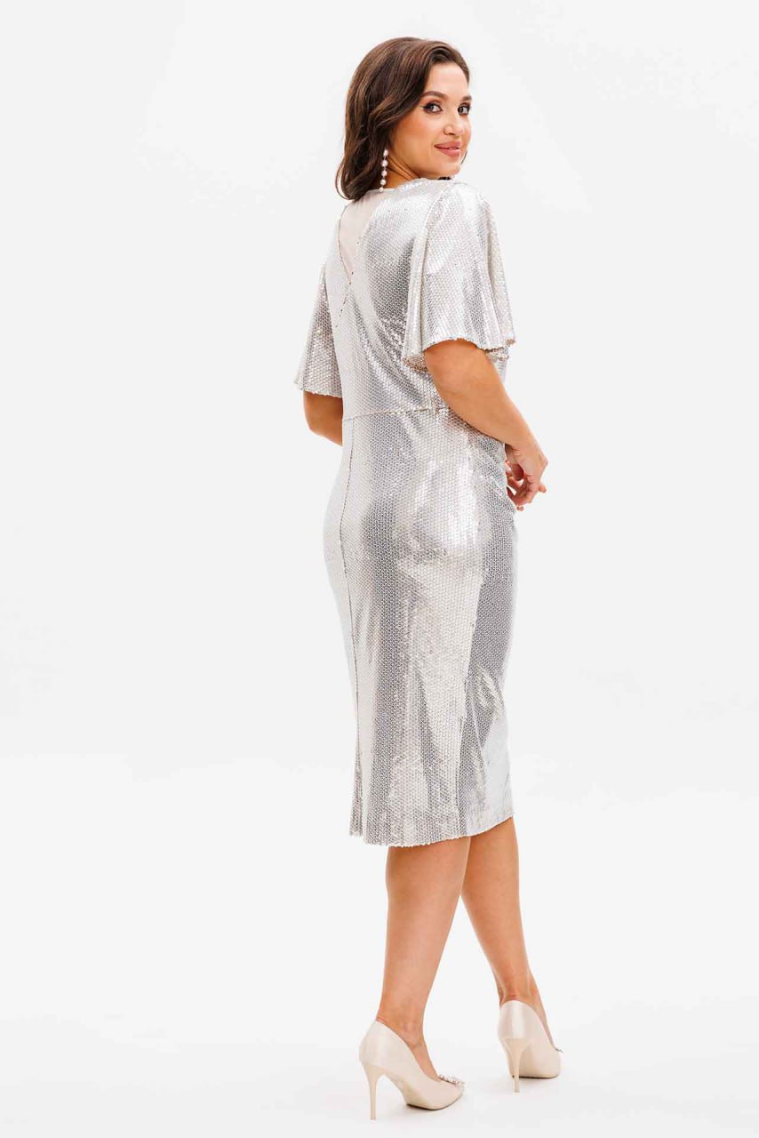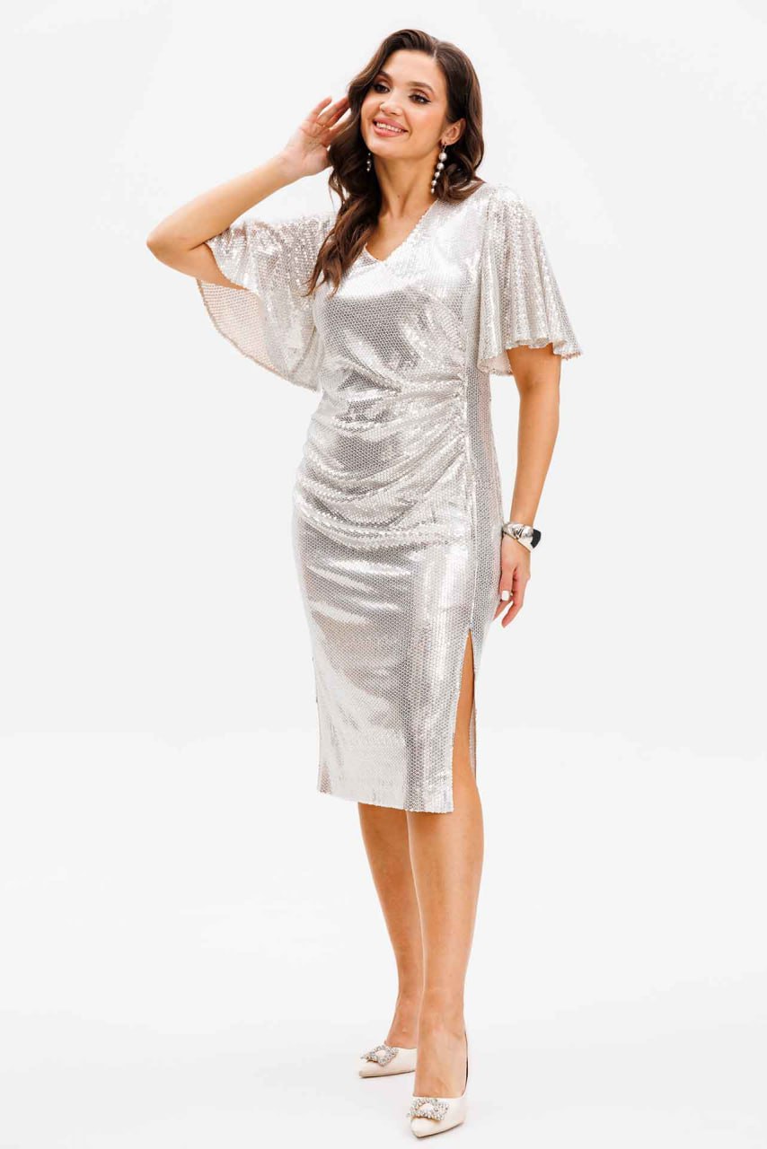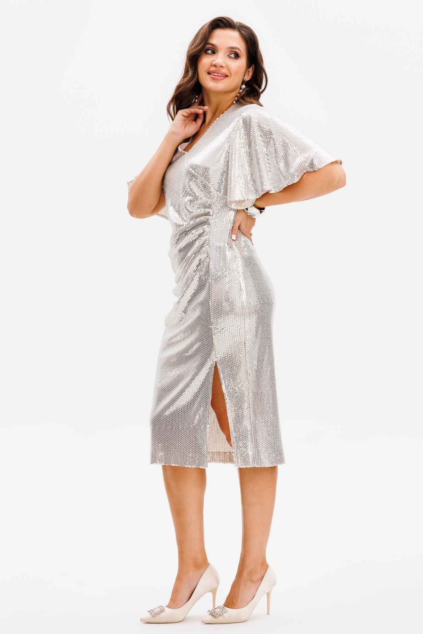 Элегантное платье серебристого цвета с блестящим отделкой, идеально подходит для вечернего мероприятия. Платье выполнено в прилегающем силуэте с изысканной V-образной горловиной и втачными рукавами-крылышками, что добавляет женственности образу. Особый акцент в дизайне платья — это драпировка, элегантно вписывающаяся в боковой рельеф. По низу рельефа присутствует разрез, подчеркивающий динамику и изящество силуэта. Спинка платья отрезная по линии талии, с средним швом и эффектной вставкой из сетки на горловине, добавляющей ноту современности и привлекательности. Платье полностью на подкладке, обеспечивающей комфорт при носке.