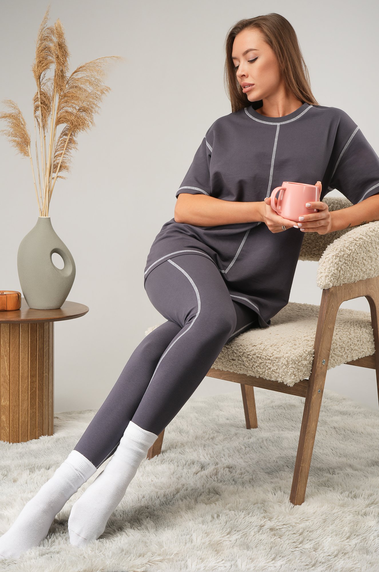 Удобный, стильный и продуманный до мел..показатьочей женский костюм с лосинами от Happyfox сочетает в себе комфорт и изящность. Темно-серый спортивный костюм станет любимым вариантом как для дома, так и для спорта.