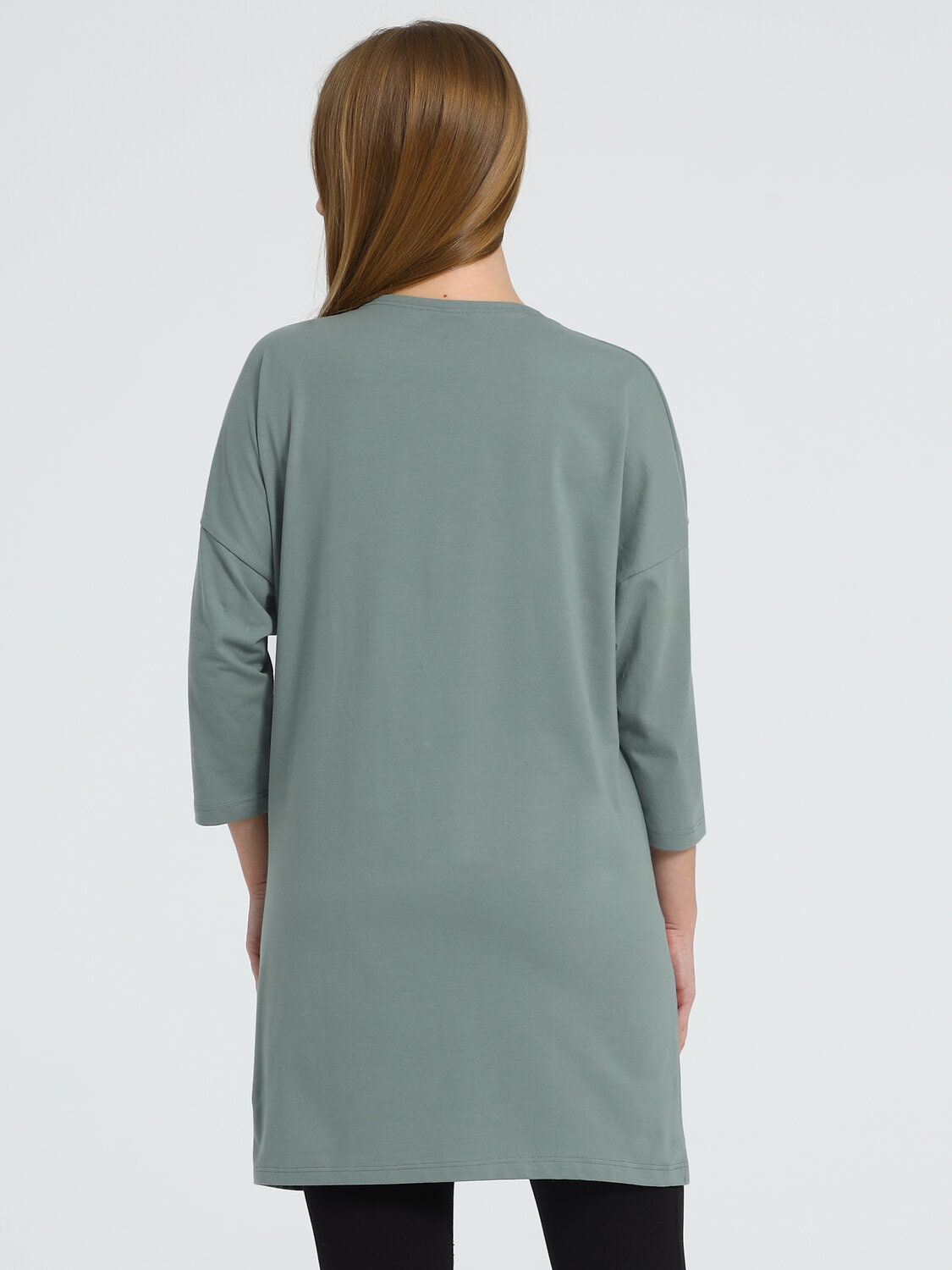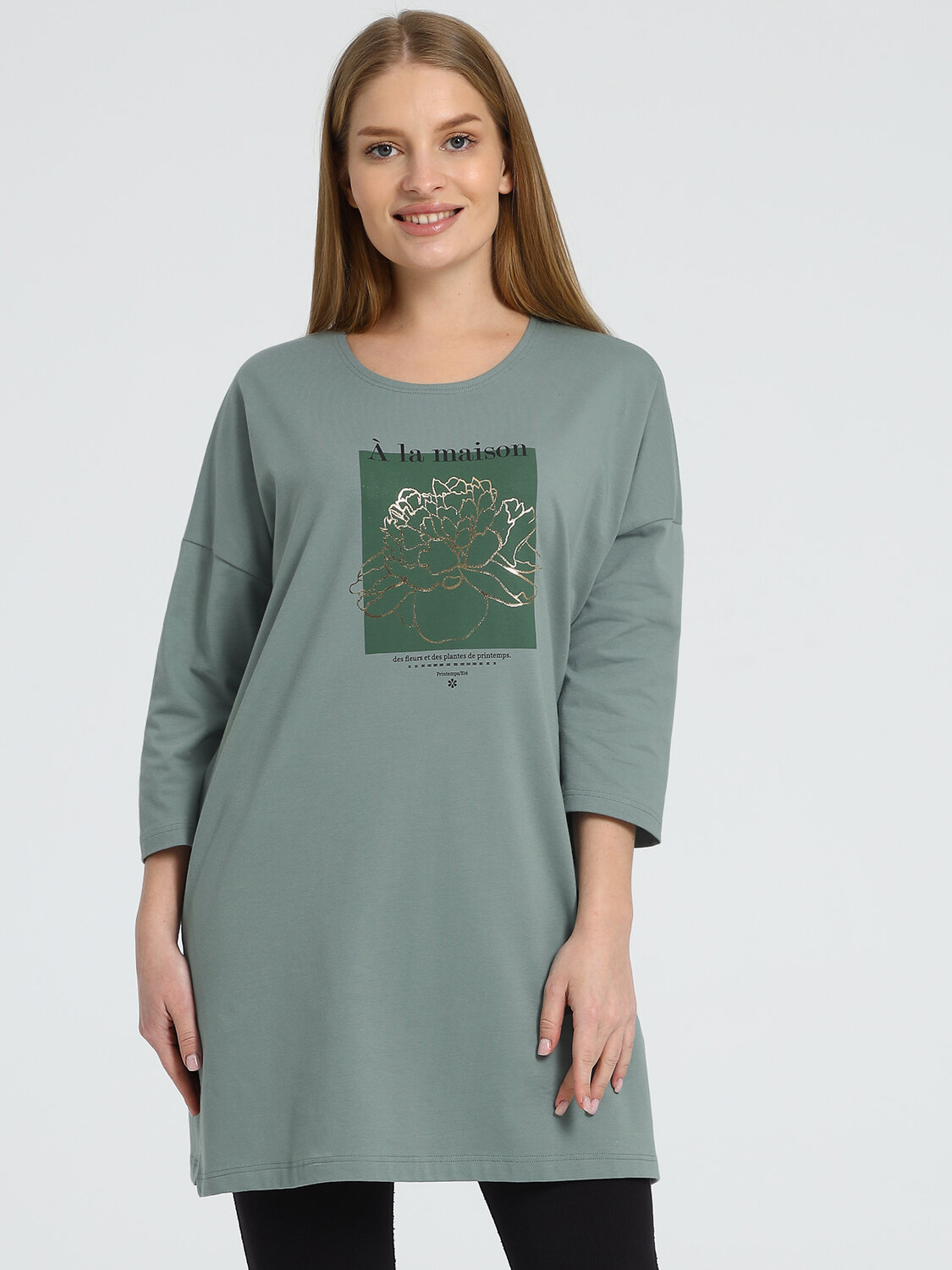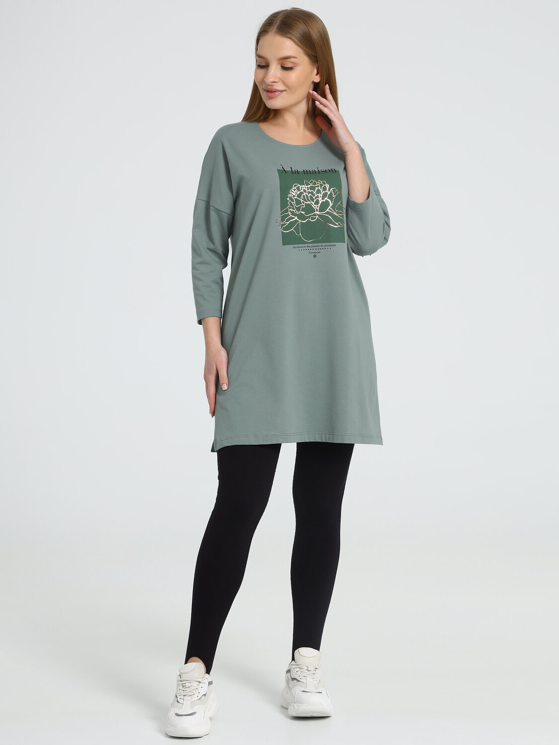 Стильная женская туника выполнена из кулира - легкого хлопкового полотна с лайкрой. Свободный крой, рукава длиной 3/4 со спущенной линией плеча, разрезы по бокам. Украшена принтом. Уход: только машинная стирка (руками не стирать!) при температуре 40 градусов, без предварительного замачивания. Изделия с печатью и декором перед стиркой необходимо вывернуть на изнаночную сторону.