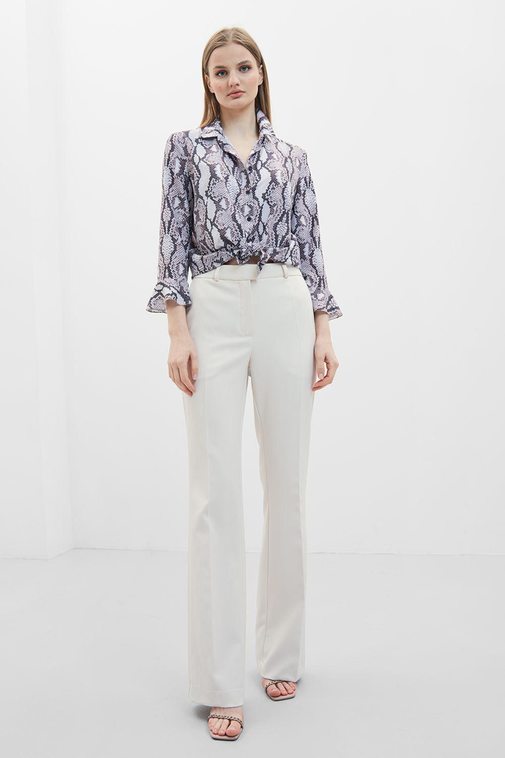 Расклешенные от колена модные брюки стали одним из главных трендов сезона. Носить брюки клеш можно с любой обувью. Характерной остается для расклешенных брюк и высокая посадка. Подобная модель аккуратно подчеркнет достоинства и скроет надостатки фигуры. Брюки полуприлегающего силуэта, расклешенные от колена, с карманами, на притачном поясе. Застежка на тесьму-молнию, крючки и петли. Возможно отличие фотографии по оттенку, связанное с разной цветопередачей монитора.