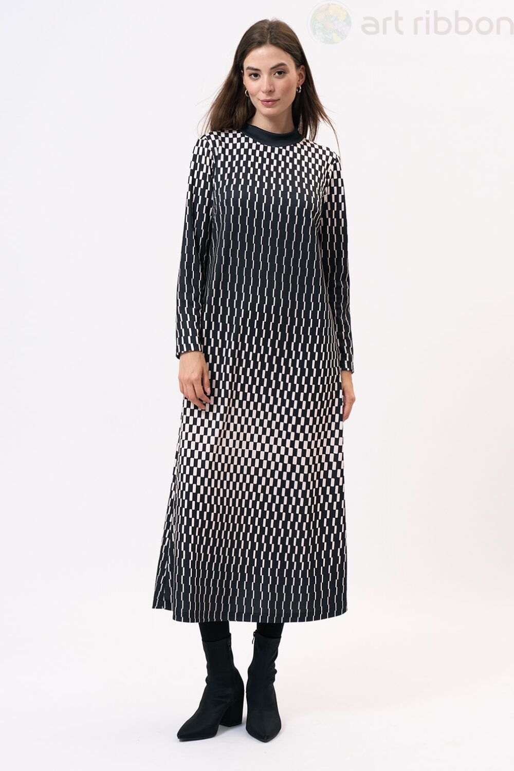 Платье полуприлегающего силуэта, выполнено из трикотажного полотна, с оригинальным принтом. Спинка платья со средним швом, в котором обработана застежка на потайную тесьму-молнию. В боковых швах обработаны карманы. Перед с нагрудными выточками. Рукав длинный, втачной. Воротник-стойка. Изделие без подкладки.