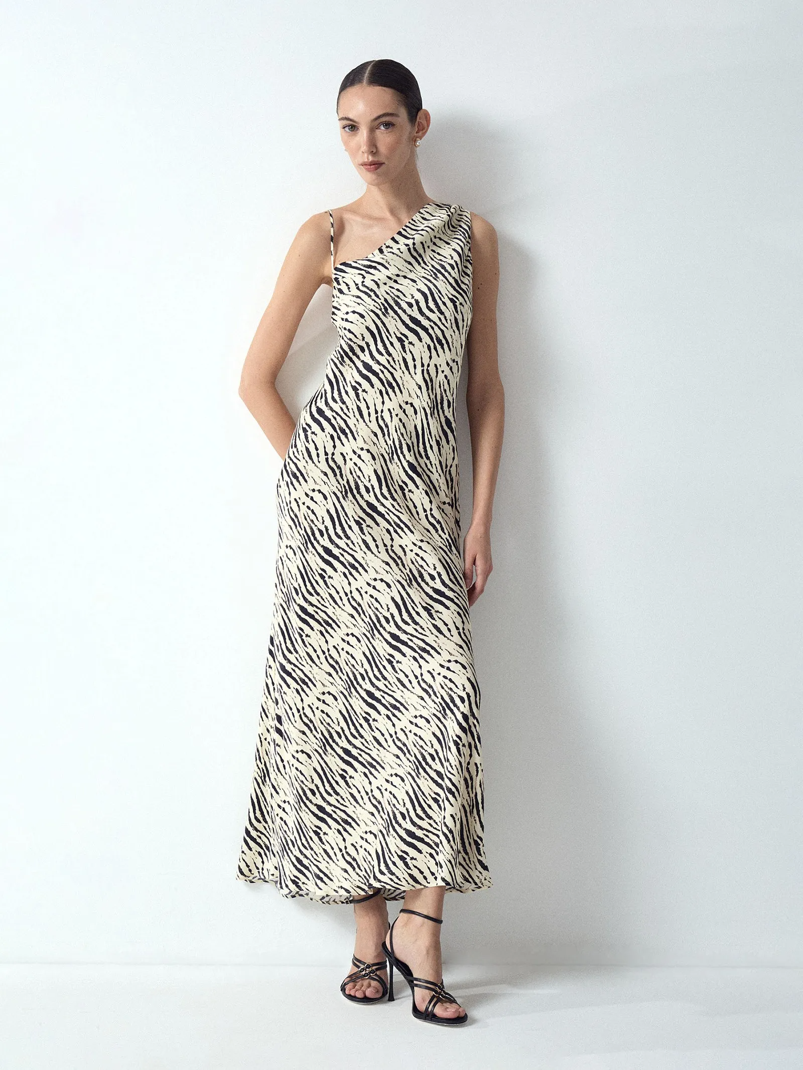 Асимметричное платье макси с абстрактным принтом создаст запоминающийся образ. Визуально вытягивает силуэт и стройнит. Подчёркивает красоту плеч и шеи. Выполнено из приятной к телу вискозы, без подкладки.
