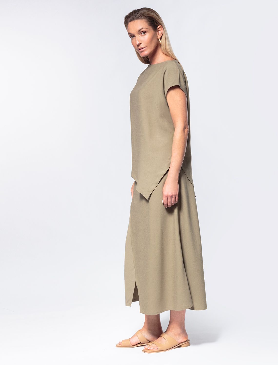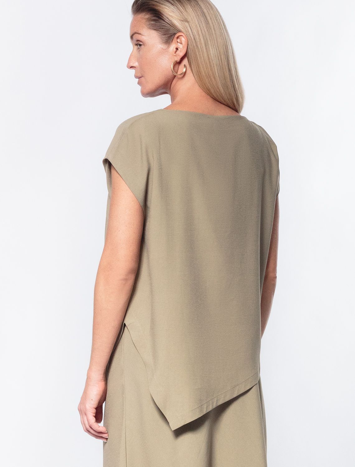 Ассиметричный топ с цельнокроеным рукавом выполнен из плотного лиоцелла. Добавление синтетических волокон в составе изделия предотвращает сминаемость. Модель золотистым логотипом бренда. Подходит для любой фигуры. Для создания расслабленного образа, сочетайте в костюме с брюками D24.214, D24.218, шортами D28.054 и юбкой D26.181 св.оливковый