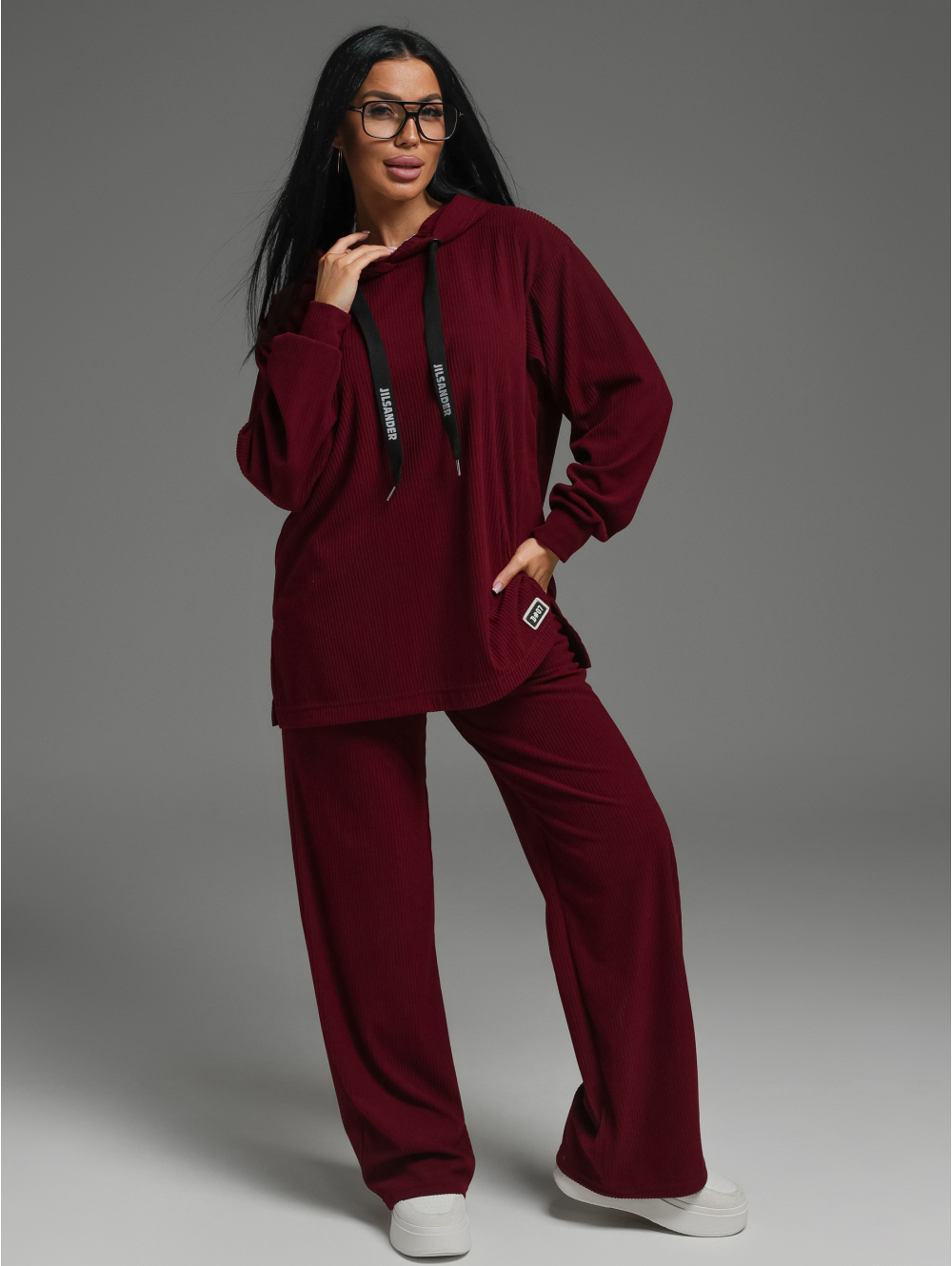Кофта с капюшоном, прямого кроя с втачным длинным рукавом и спущенным плечом. Штаны широкие на резинке.