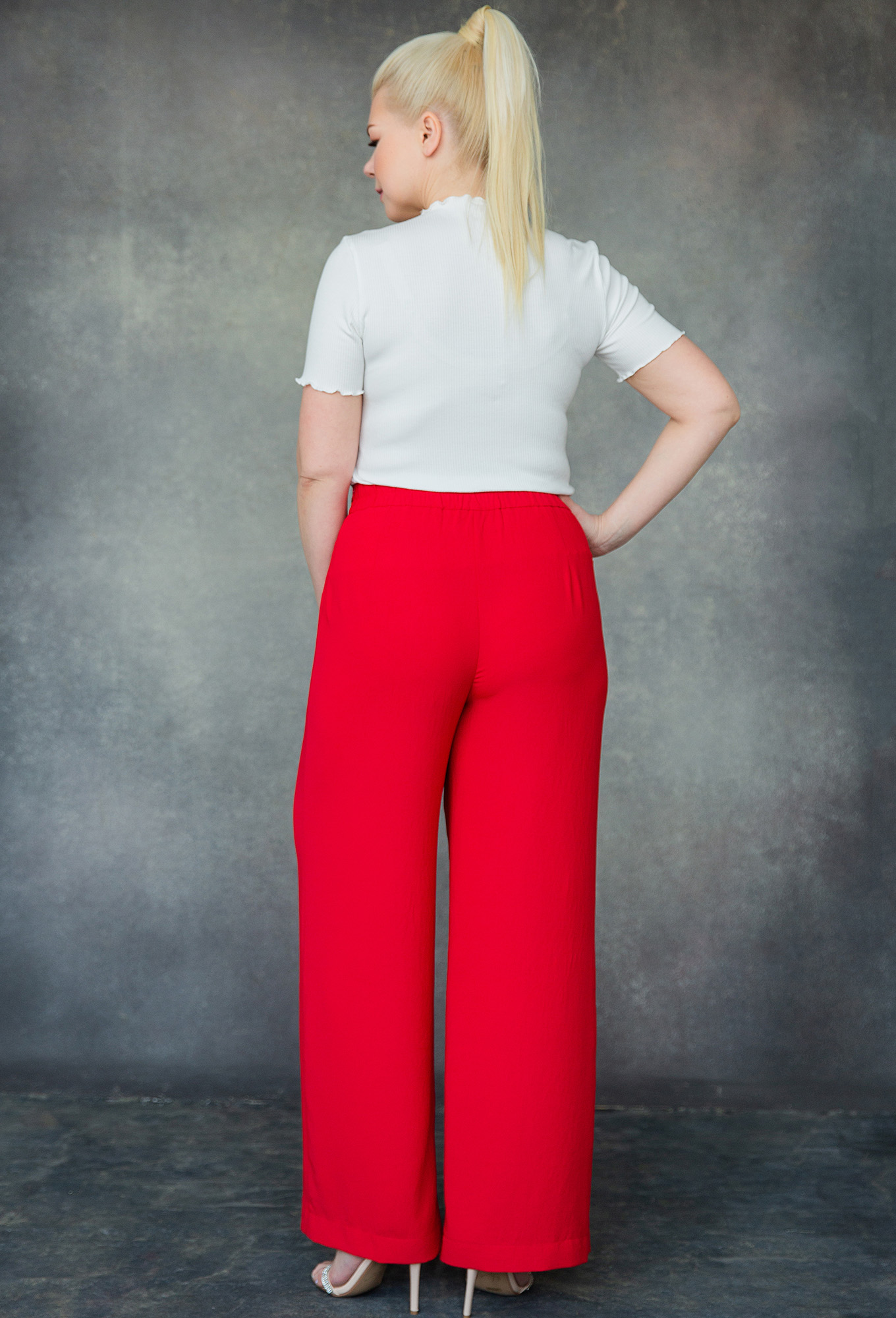 Брюки прямые с застежкой на потайную молнию и пуговицу в боковом шве. По спинке резинка по поясу.