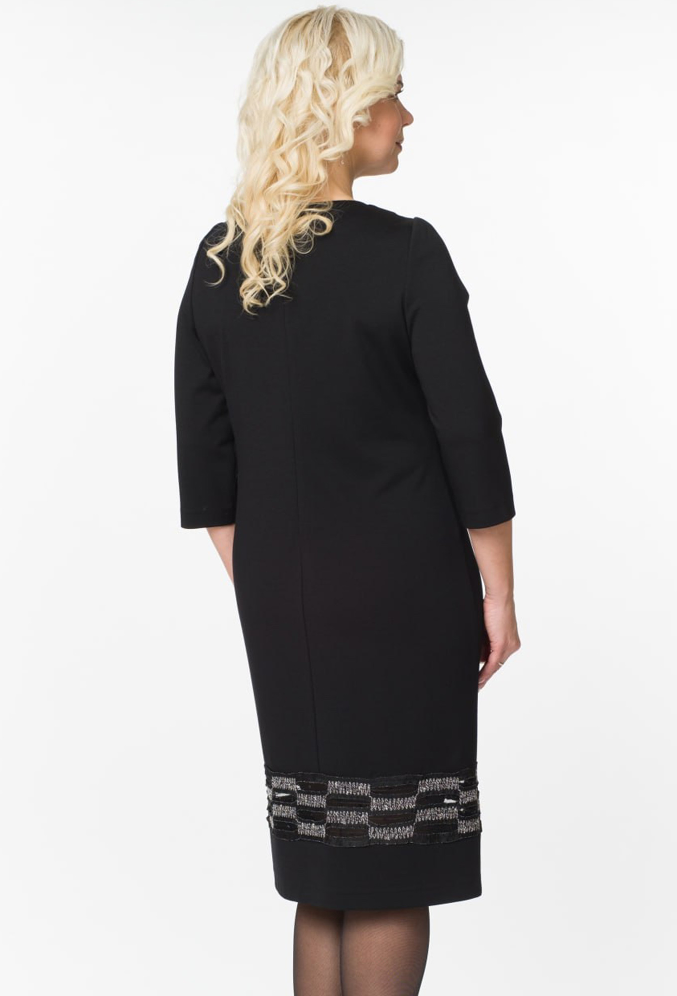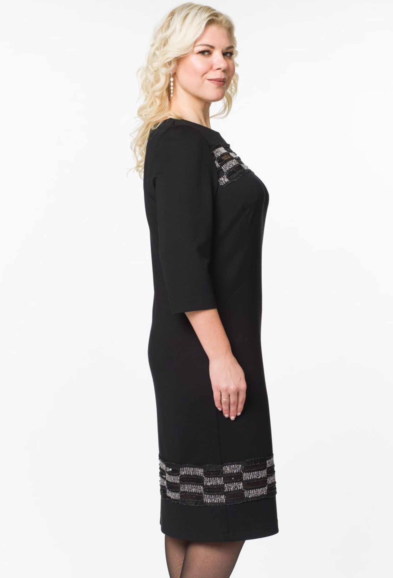 Платье полуприлегающего силуэта с округлой горловиной, застежкой потайную молнию в среднем шве спинки. Рукава втачные ¾. По переду и низу изделия прозрачные вставки с пайетками.