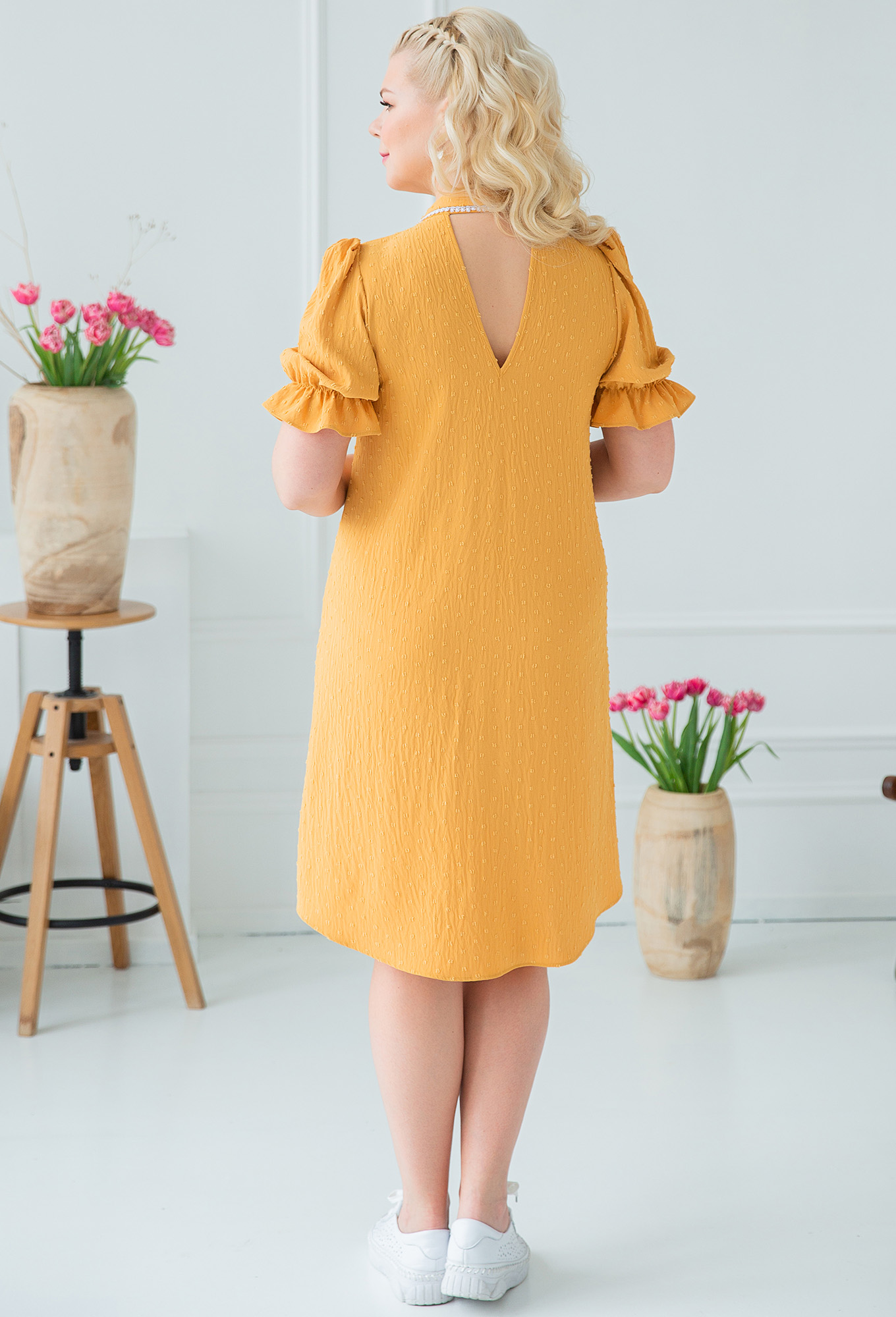 Платье расширенного силуэта с коротким рукавом. Горловина округлая с рубашечным воротником. По спинке V-образный вырез. Рукав со складками по окату и резинкой на расстоянии от низа. Низ закругленный с разрезами по боковым швам.