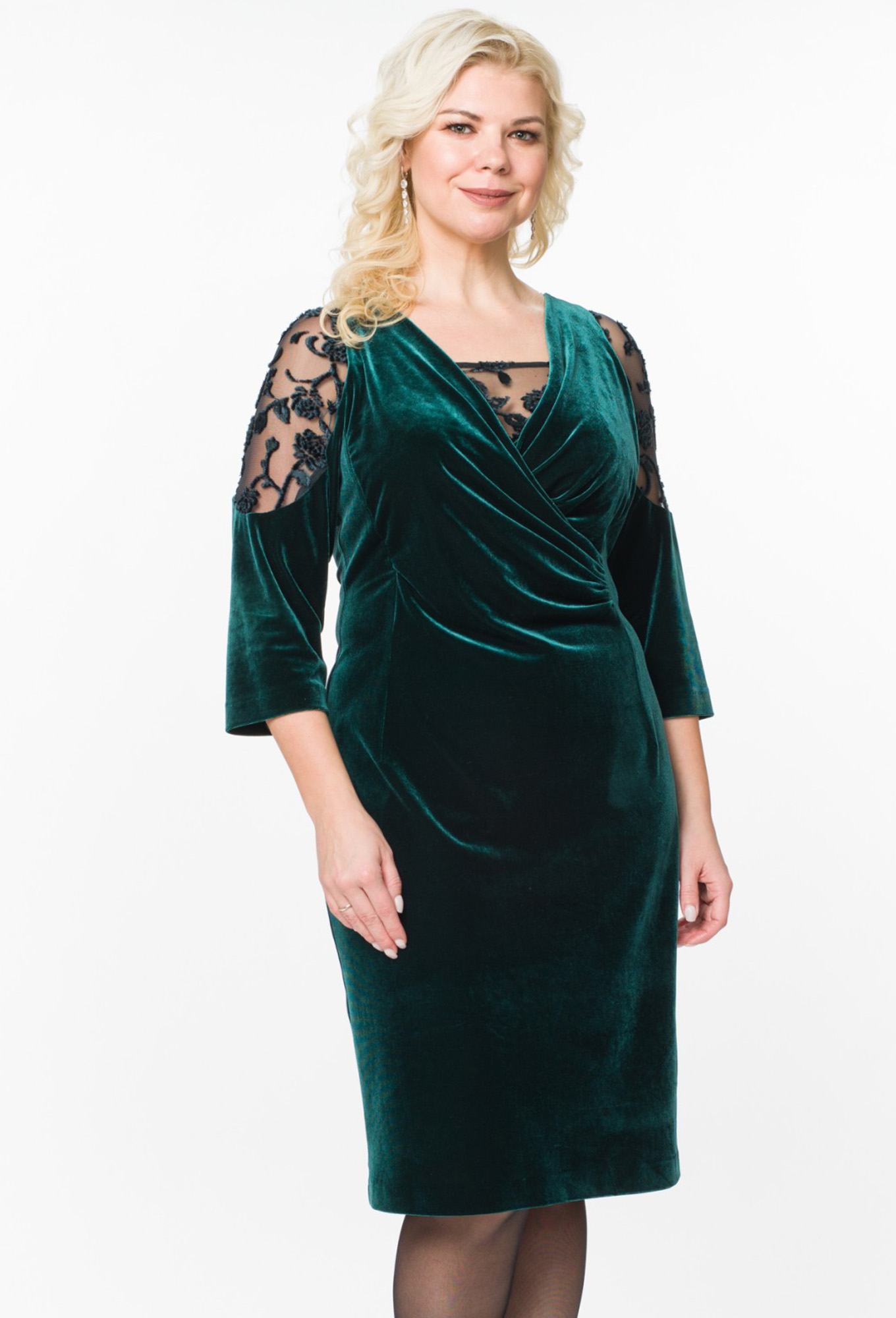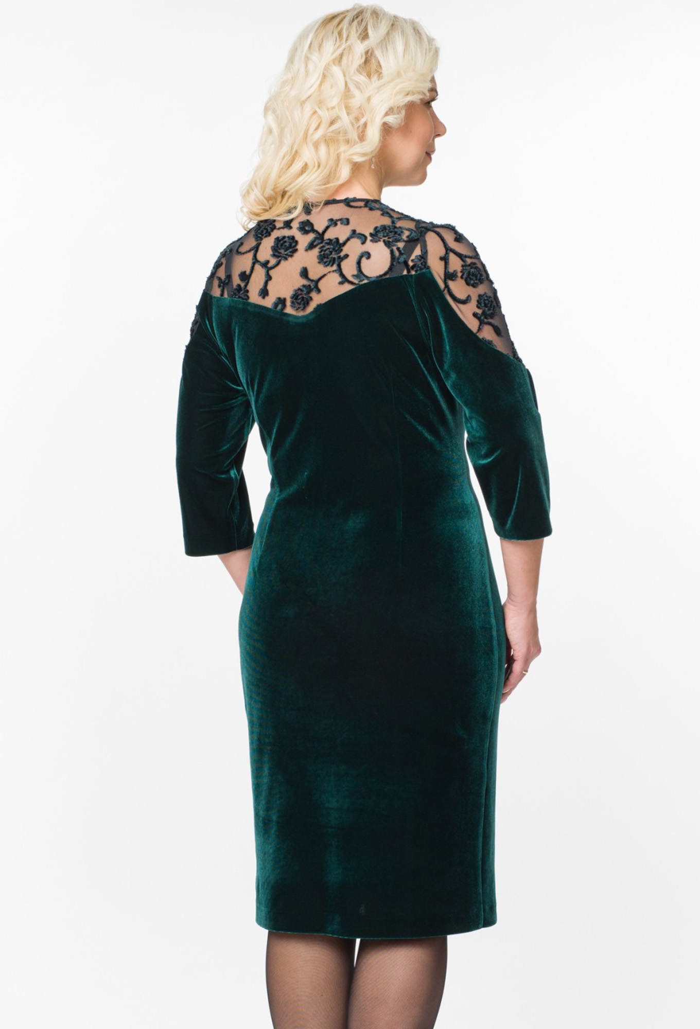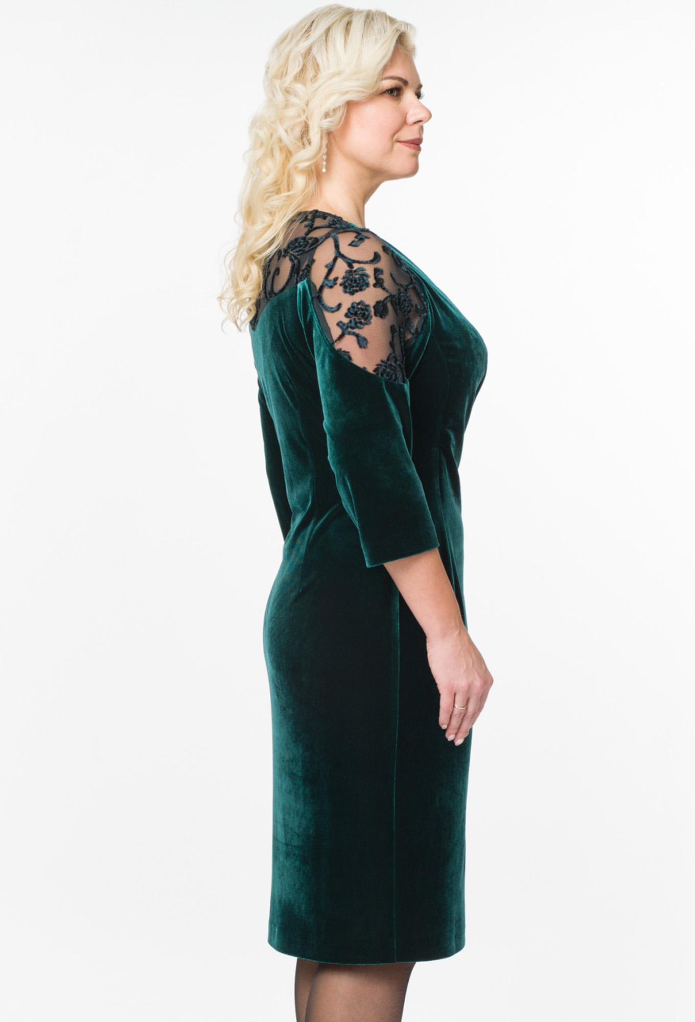Платье полуприлегающего силуэта, по переду обработана деталь на запах, с подставленной отделочной деталью из сетки с бархатным дизайном. Платье очень нарядное. Трикотажный бархат позволяет чувствовать себя в этом изделии комфортно. Вы будете очень довольны посадкой изделия и выглядеть великолепно. Длина изделия - 101см, длина рукава - 49см.