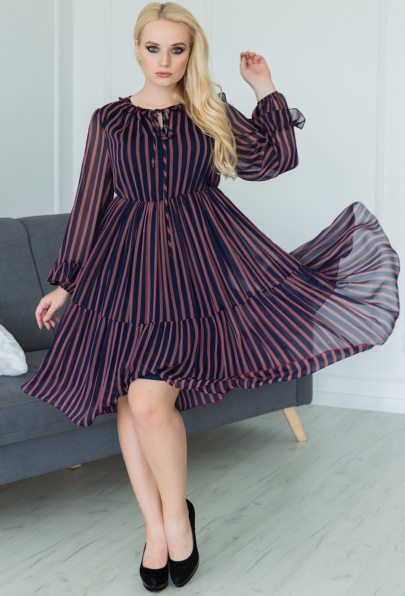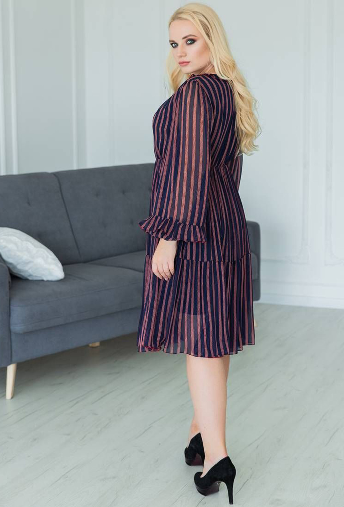 Платье полуприлегающего силуэта с длинным рукавом. Горловина округлая с рюшей и завязкой. Перед и спинка отрезные по линии талии, по низу рукава и по линии талии резинка.